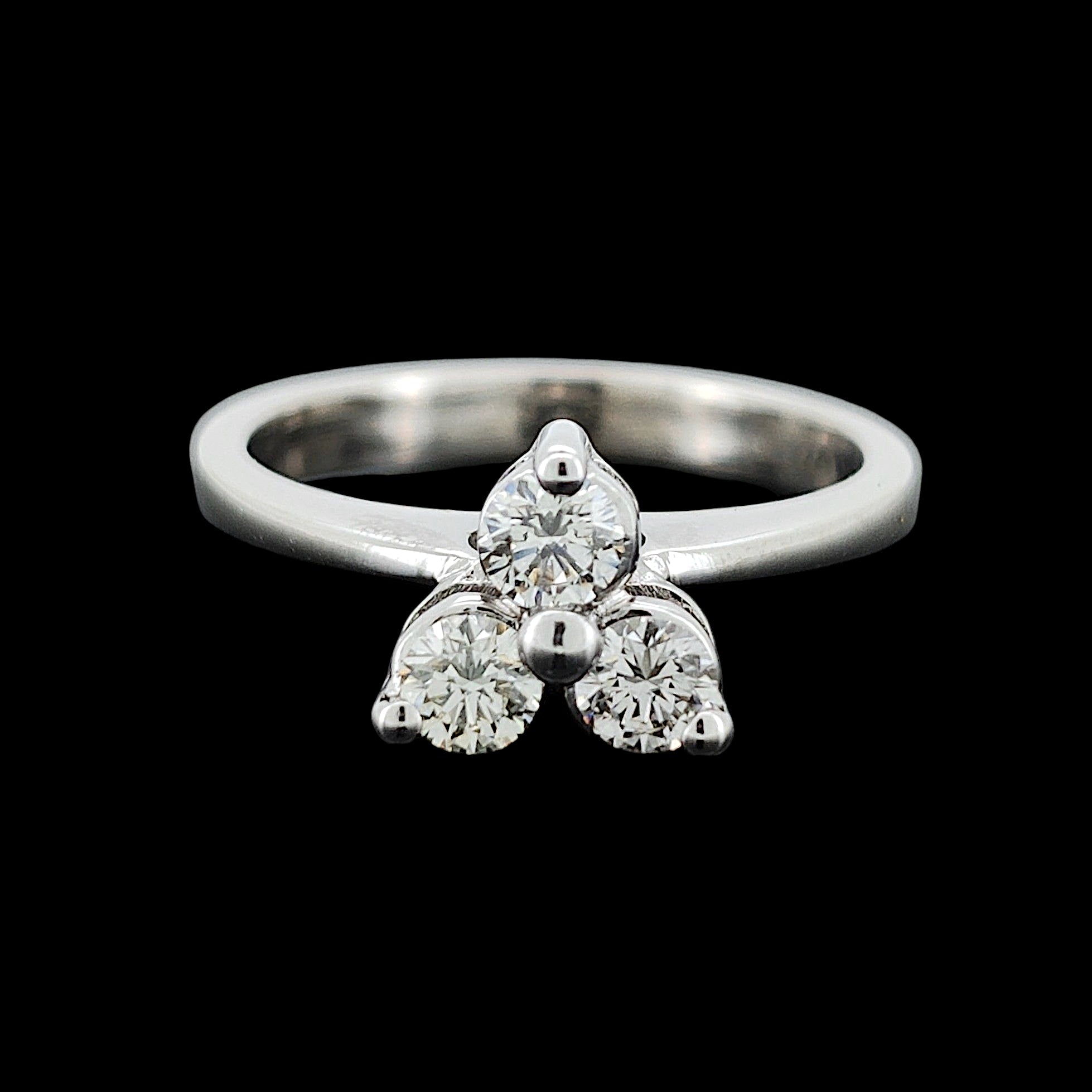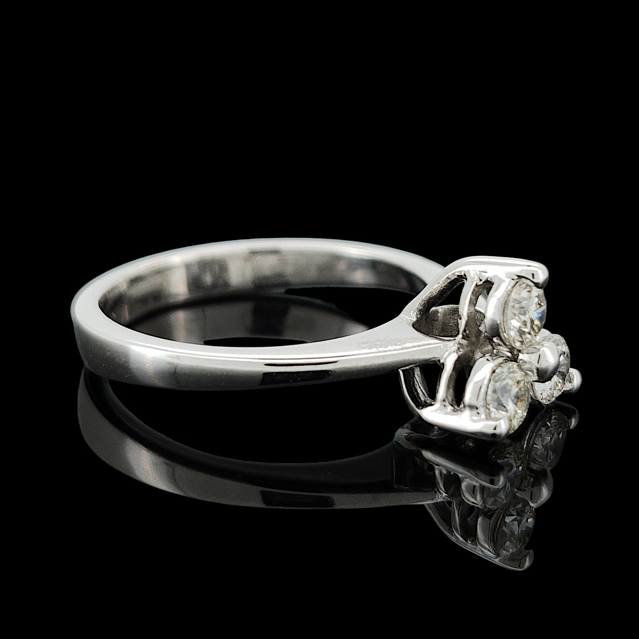 A fantastic contemporary ring featuring three, round, brilliant cut diamonds weighing an estimated total of 0.30 carats, claw set and mounted in 18ct white gold.