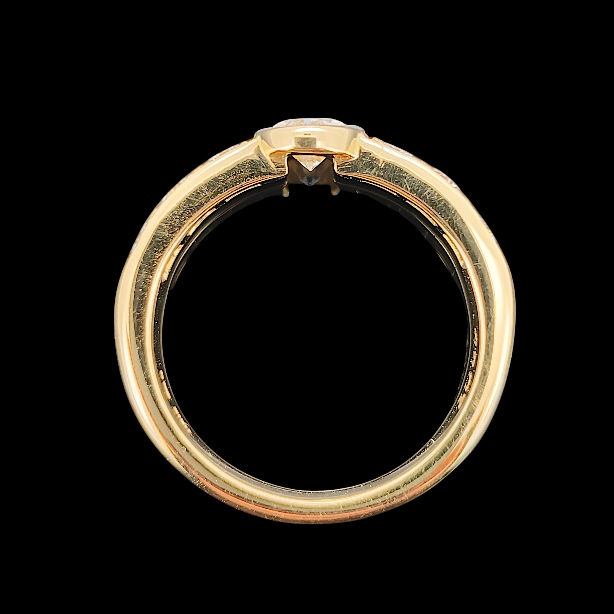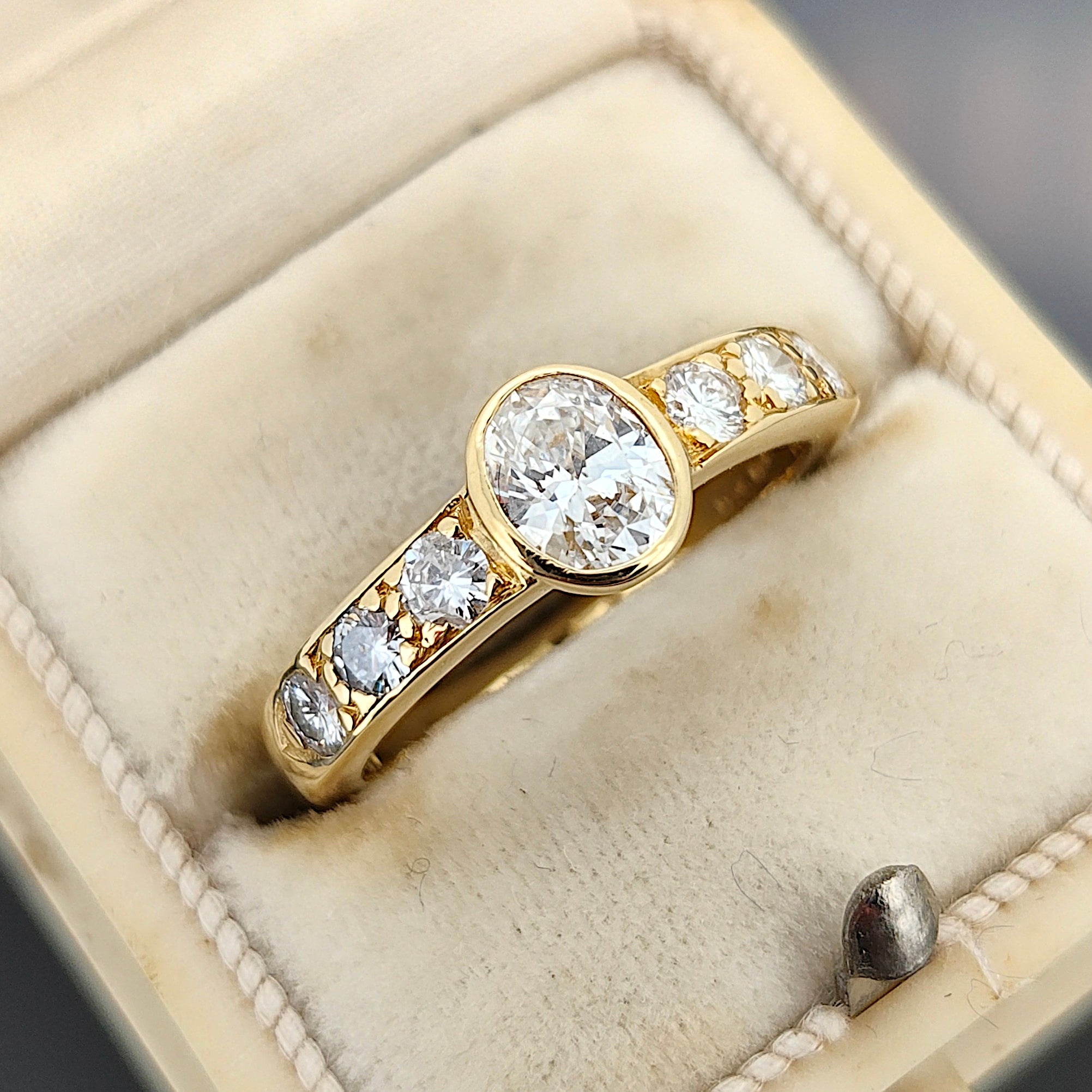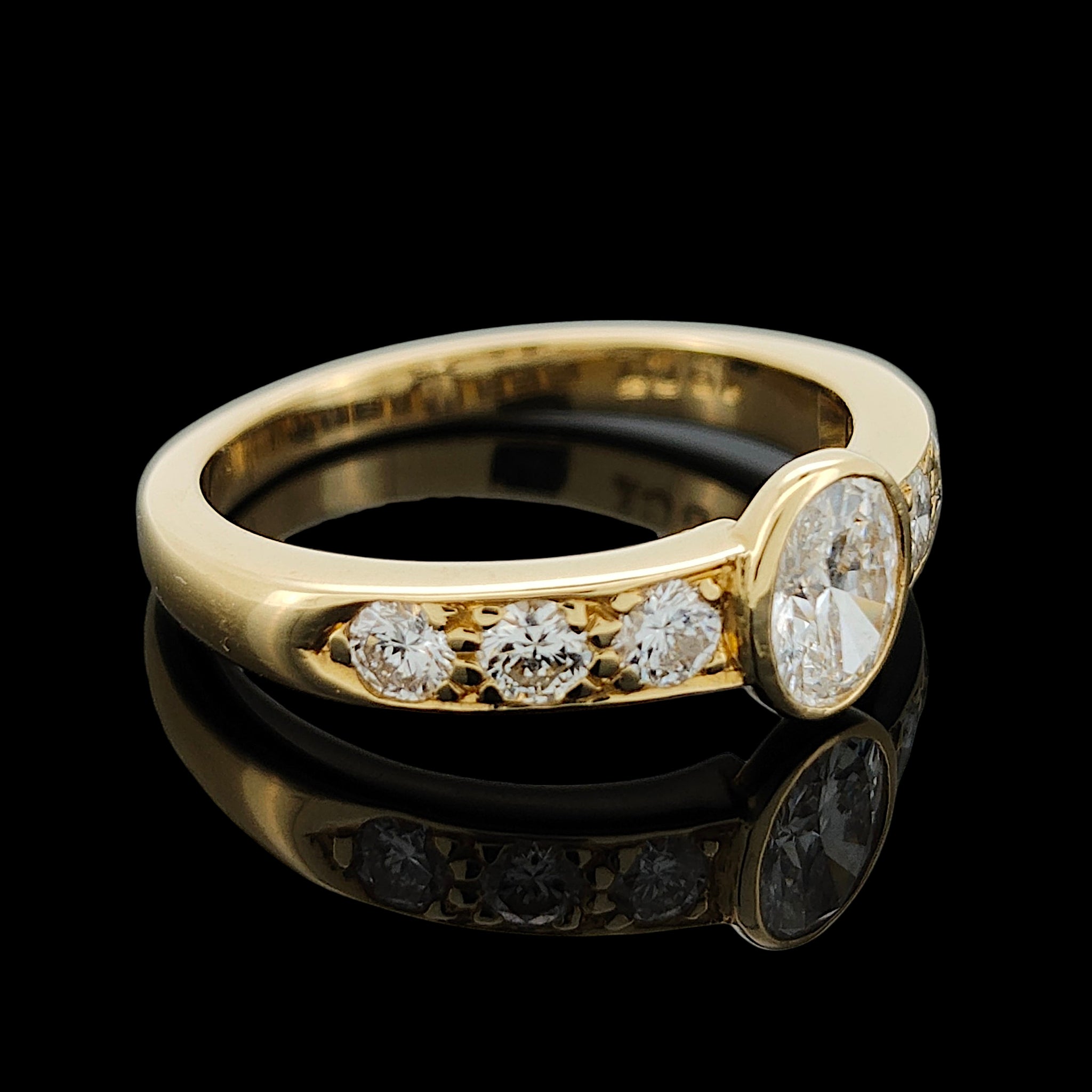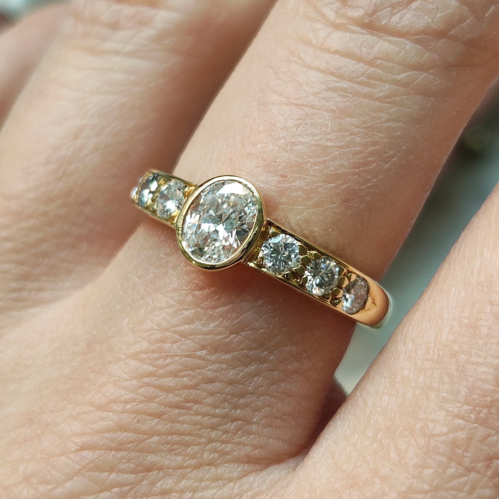 An impressive and beautiful solitaire diamond ring with diamond shoulders, the central oval cut diamond rubover set and weighing an estimated 0.45 carats, with three brilliant cut diamonds set to each shoulder, weighing an estimated total of 0.36 carats, mounted in 18ct yellow gold.