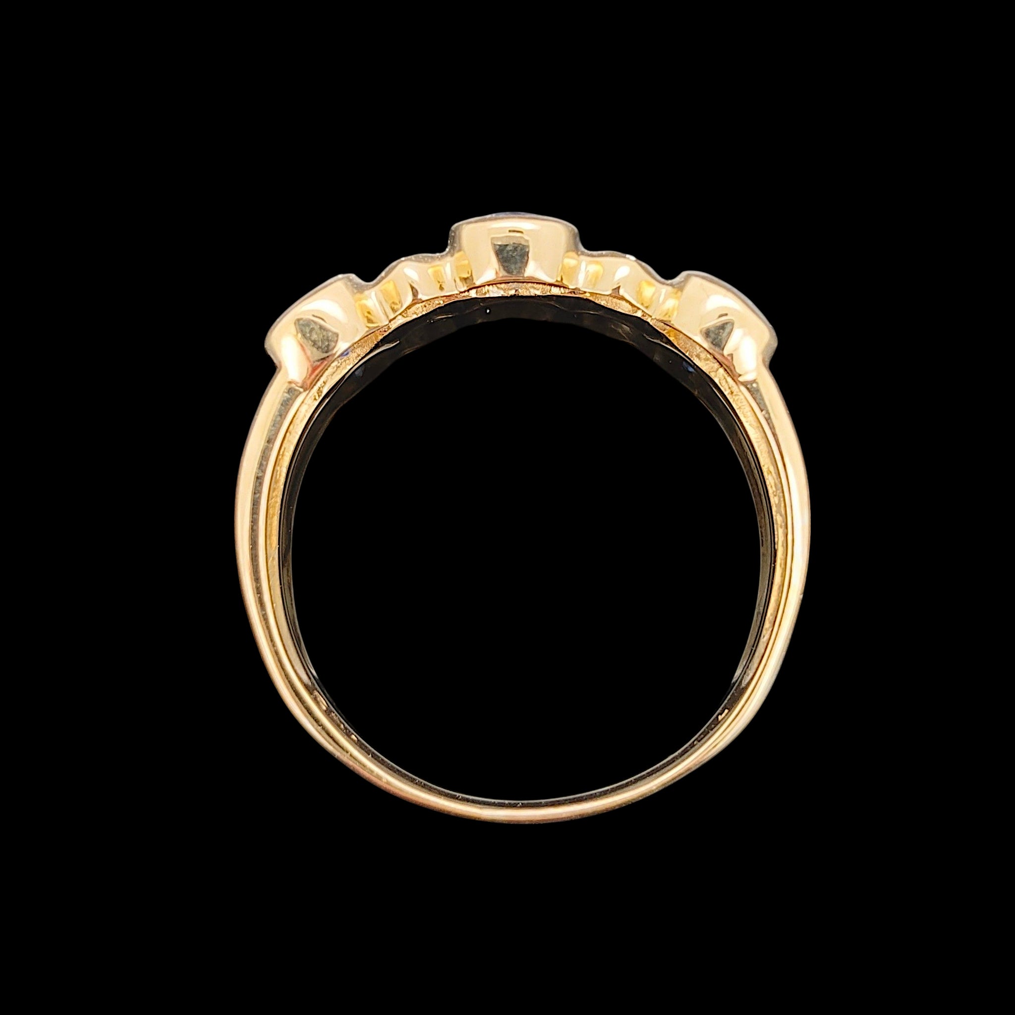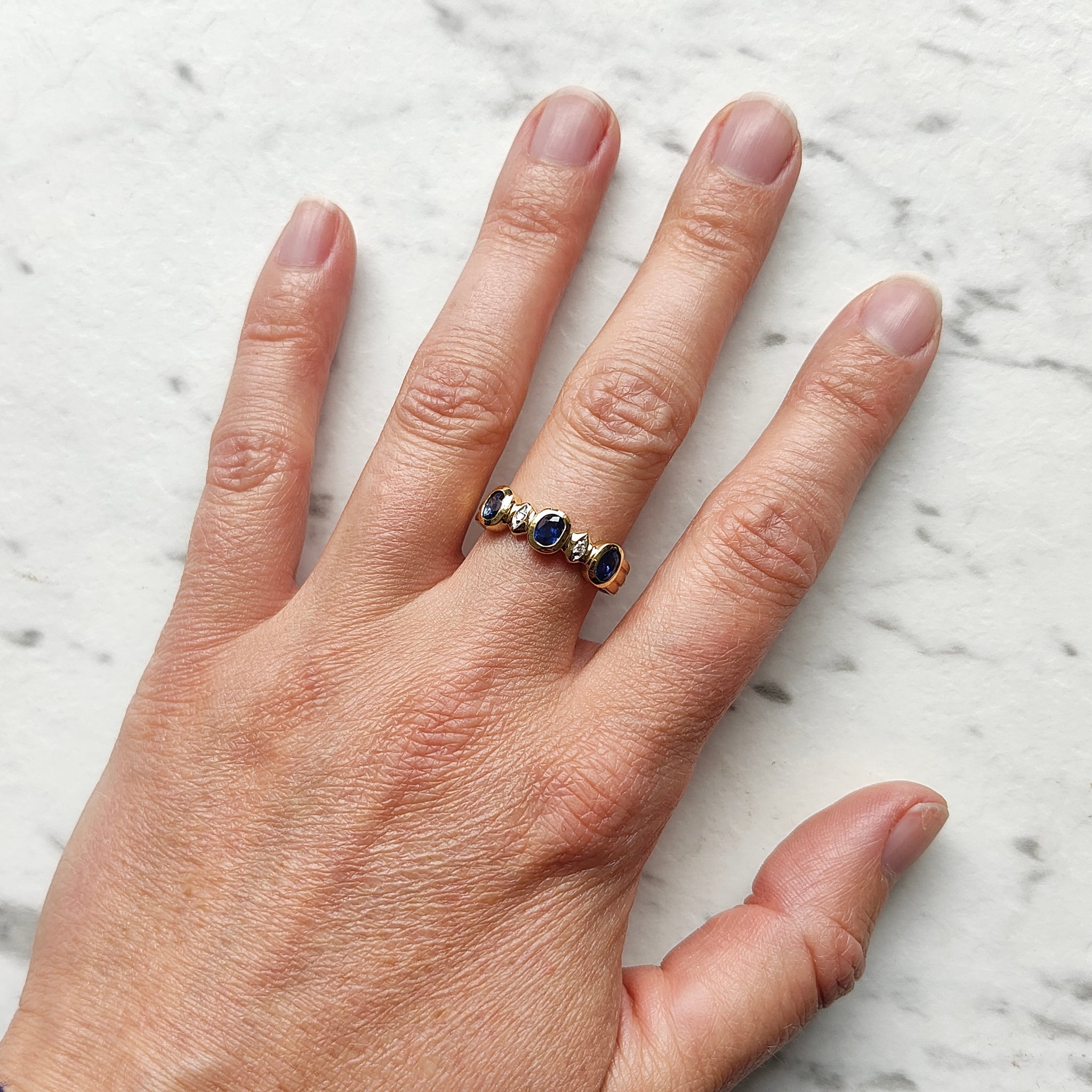 An attractive five stone ring featuring three oval sapphires that are individually bezel set, with a small diamond set between each, mounted in 18ct yellow gold.