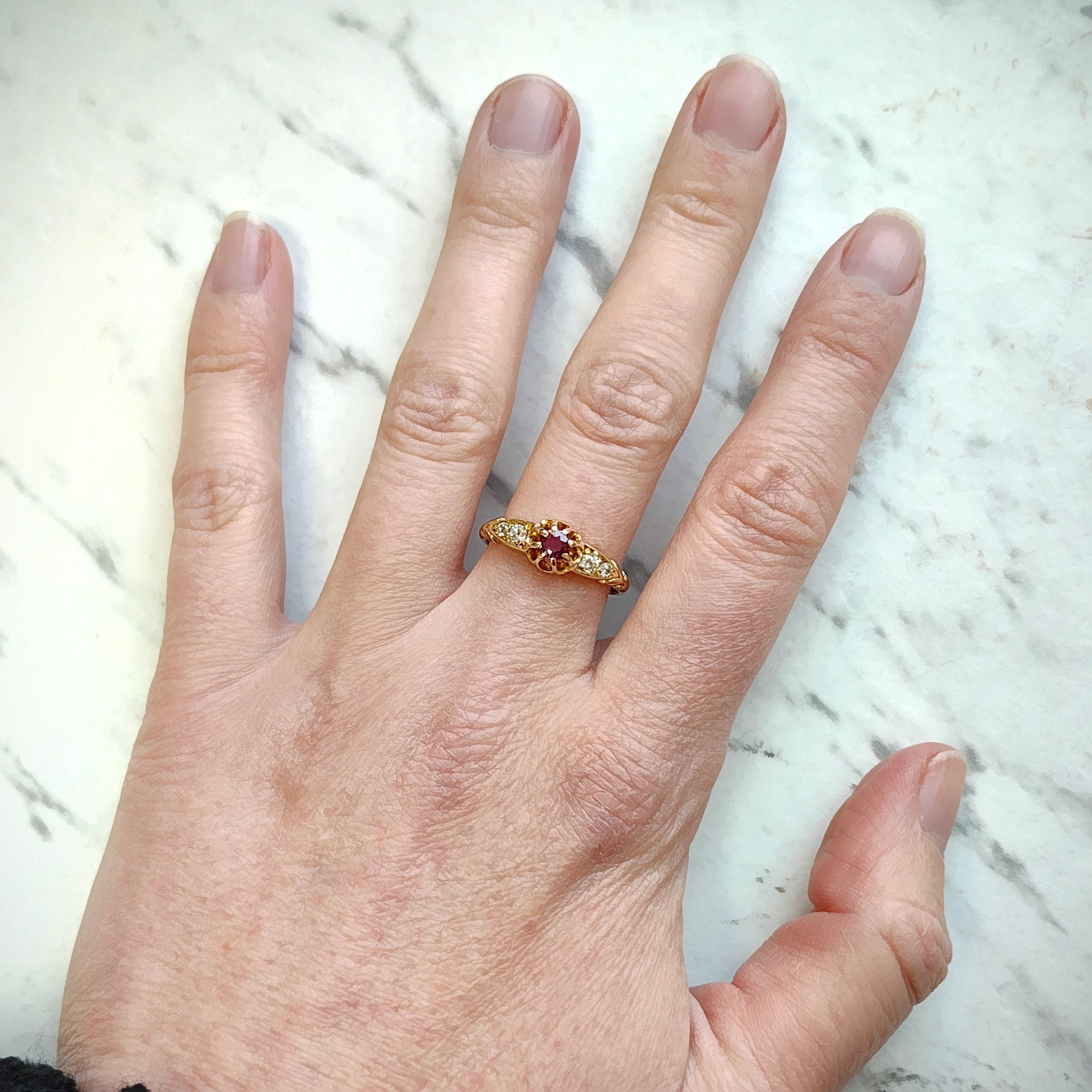 CONDITION: In overall very good antique condition, with some light surface wear commensurate with age. The central ruby has some wear/nibbling when viewed under magnification.
