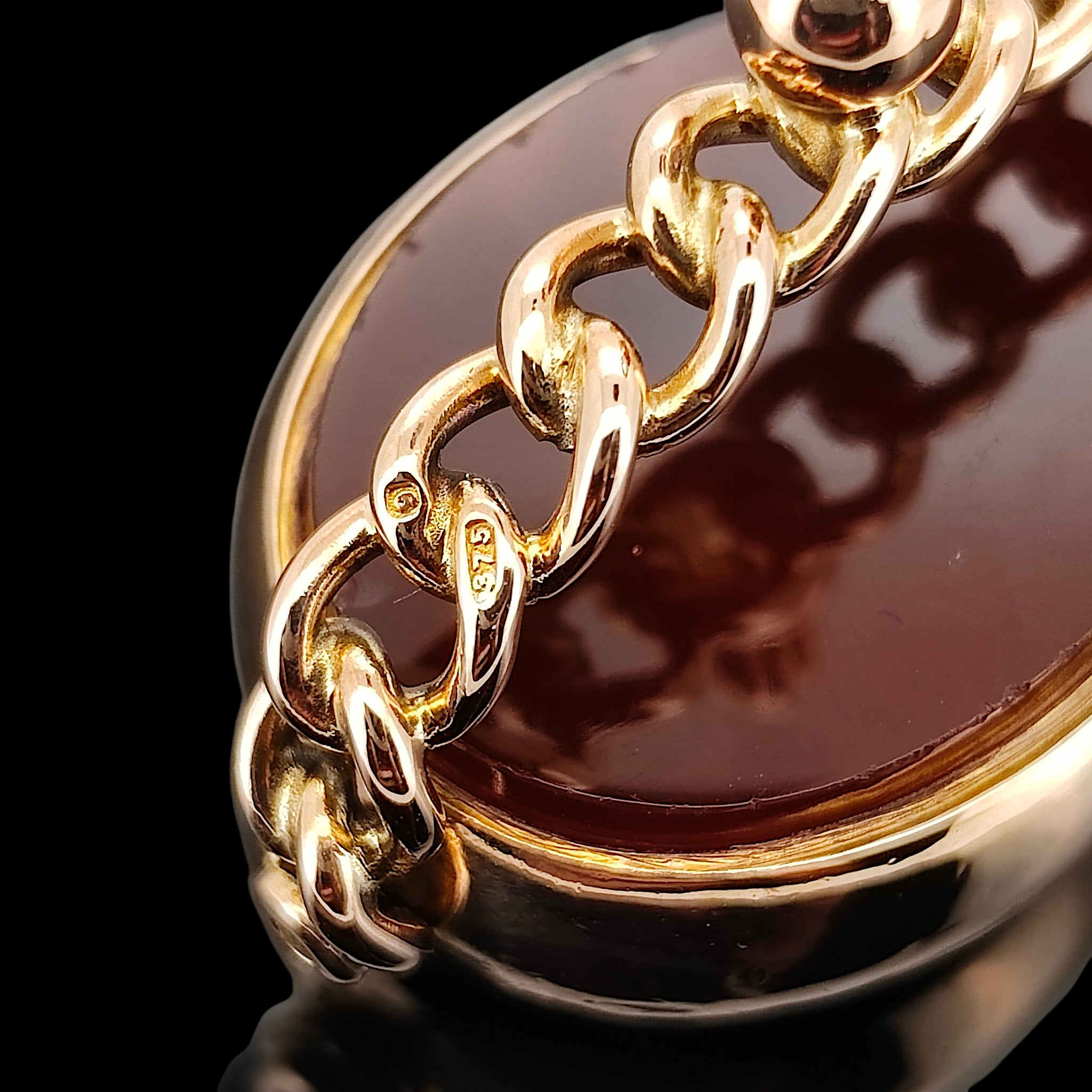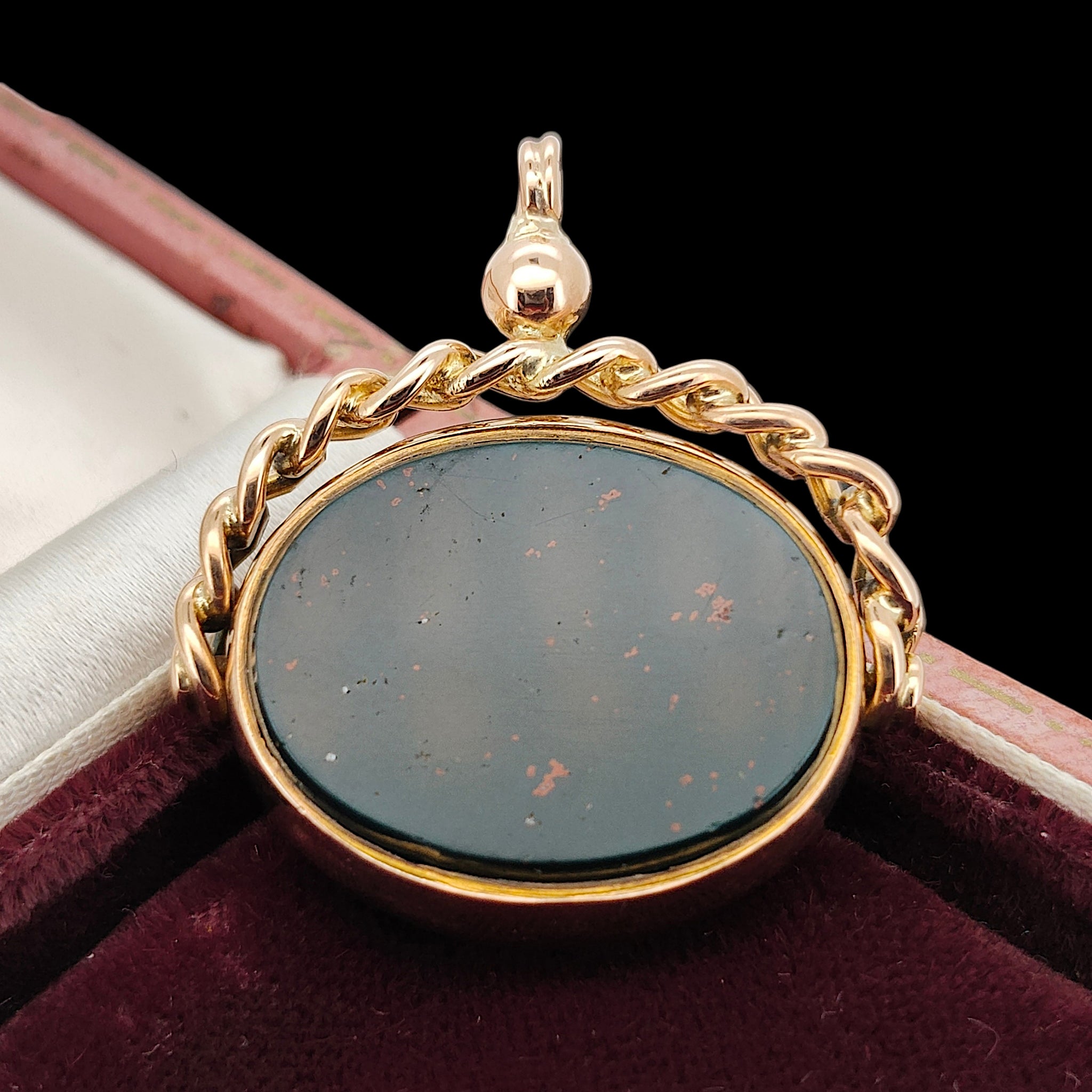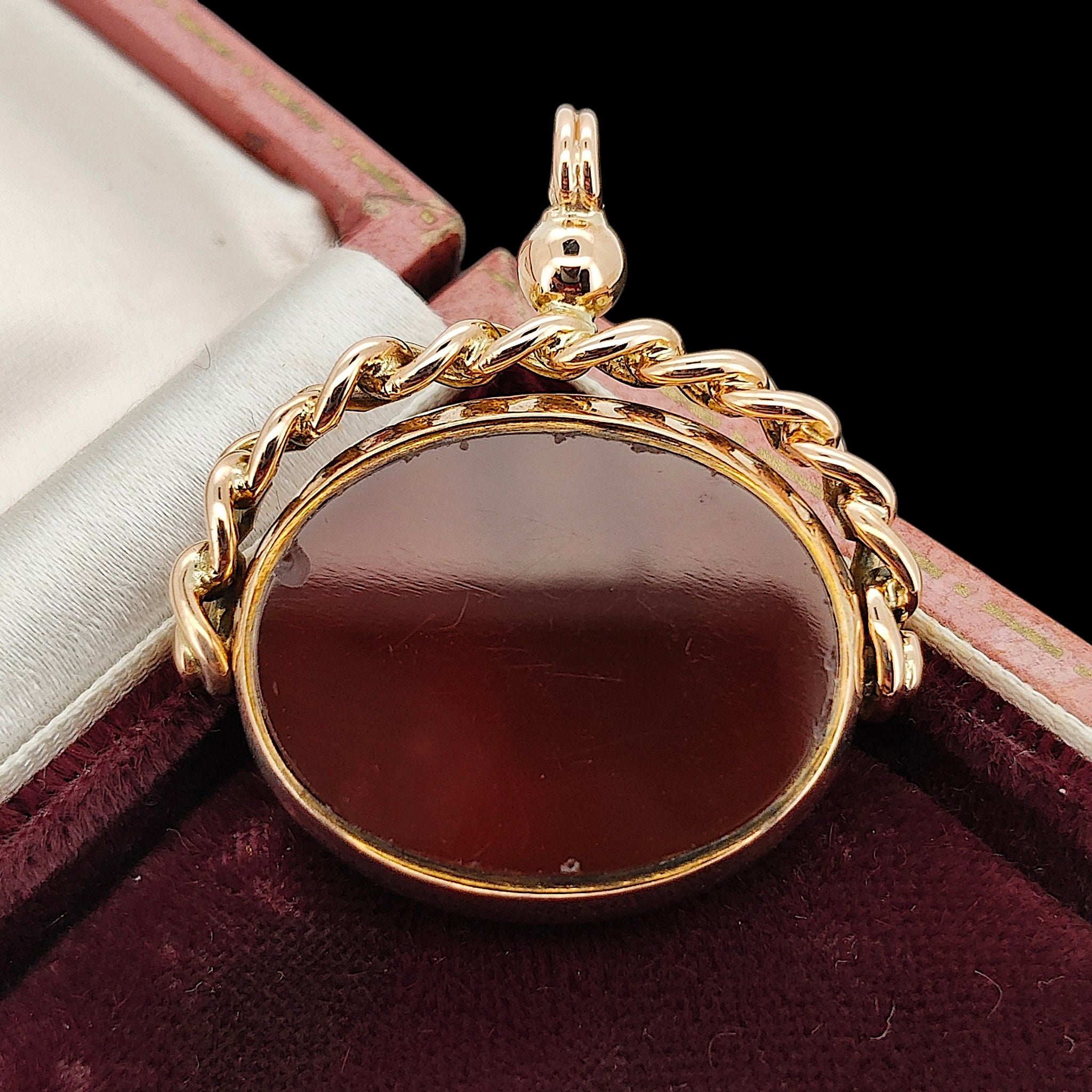 A beautiful antique swivel fob pendant crafted in 9ct yellow gold, set with bloodstone to one side and carnelian to the other. The top frame is a curb link, and there is a partial 9ct gold hallmark to the side of the fob. A traditional antique piece which would have been traditionally attached to a watch chain.