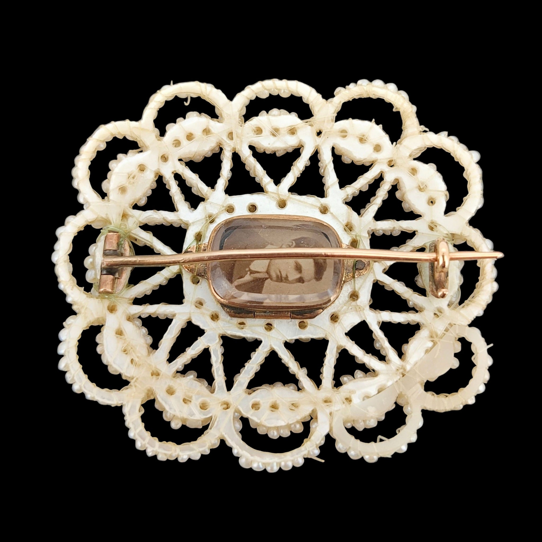 A beautiful mourning brooch, made of many seed pearls which have been finely entwined using clear wire, and are backed with a carved mother of pearl plaque. In the centre is a glass locket compartment, which houses a small lock of hair. The reverse shows a small portrait of a gentleman. With a gold pin and 'C' catch fitting.