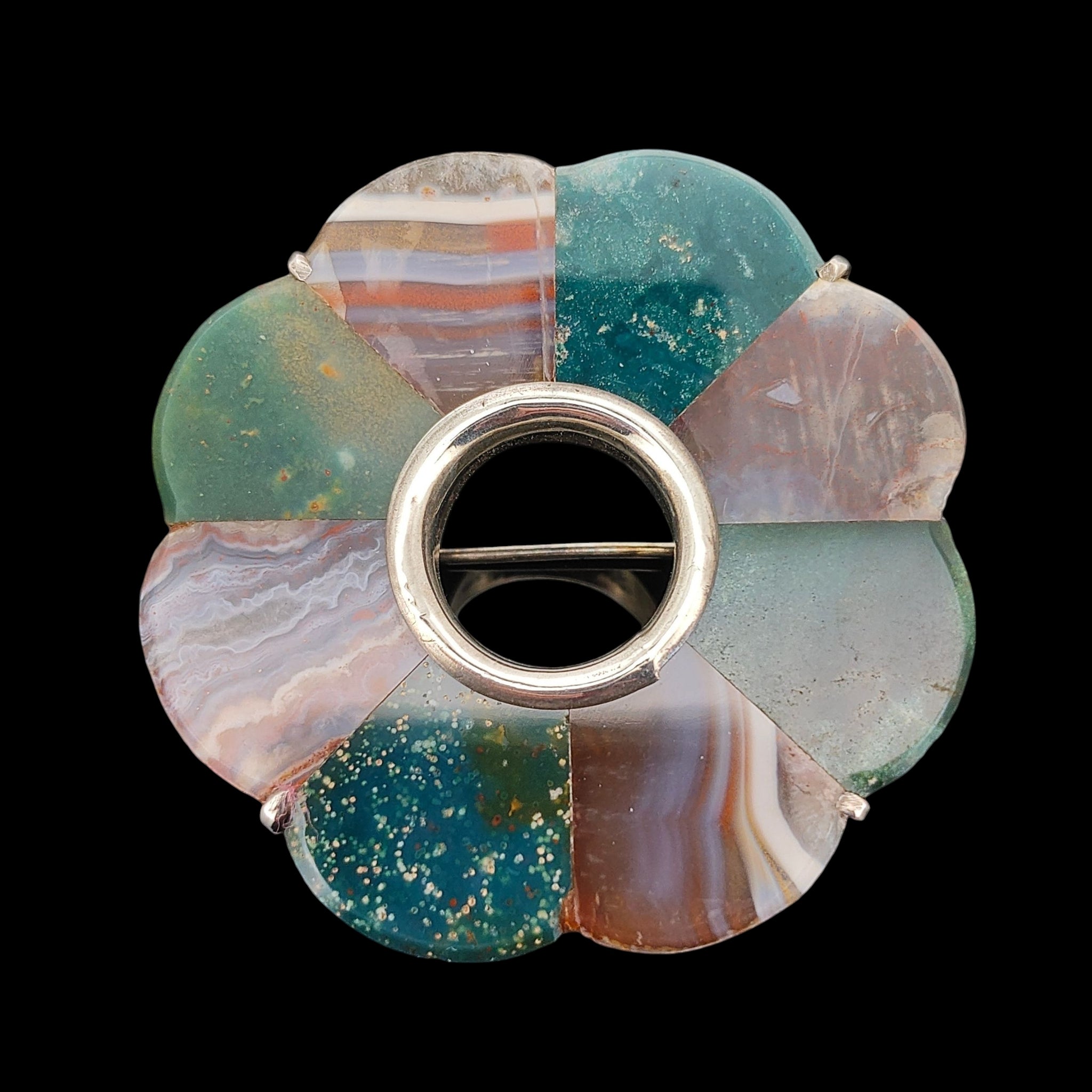 The iconic Scottish aesthetic of antique agate pieces is certainly striking, and this brooch is a great example as to why! Set with varying hues of banded agate, this circular brooch is set substantially in silver with a traditional pin and 'C' catch to the reverse.