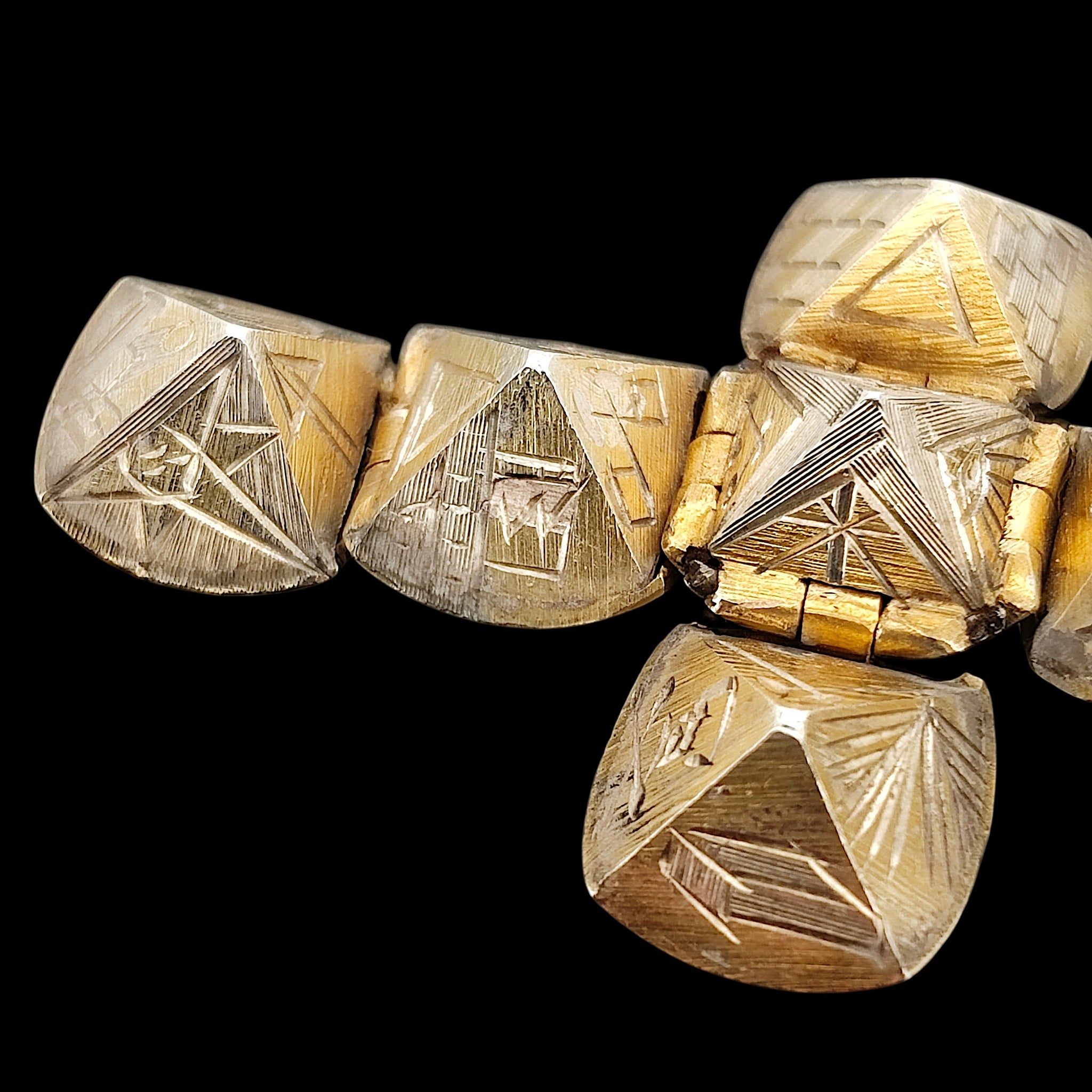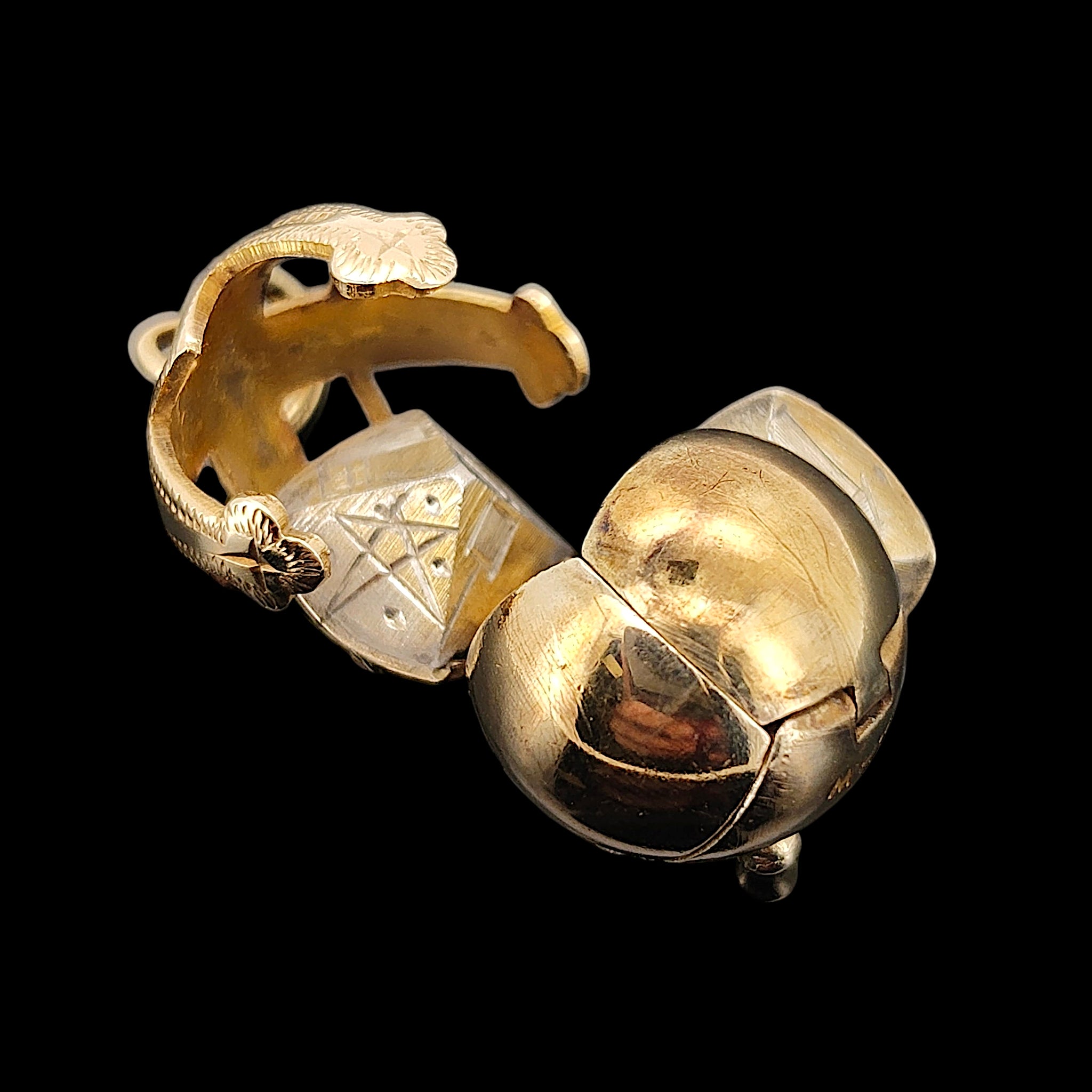 An intriguing and ever-popular folding masonic ball, crafted in silver and 9ct yellow gold. The ball is clasped, and can be unfolded to reveal a cross which is engraved with a multitude of masonic symbols. A fun piece to add to an Albert, charm bracelet or wear as a pendant on a chain.