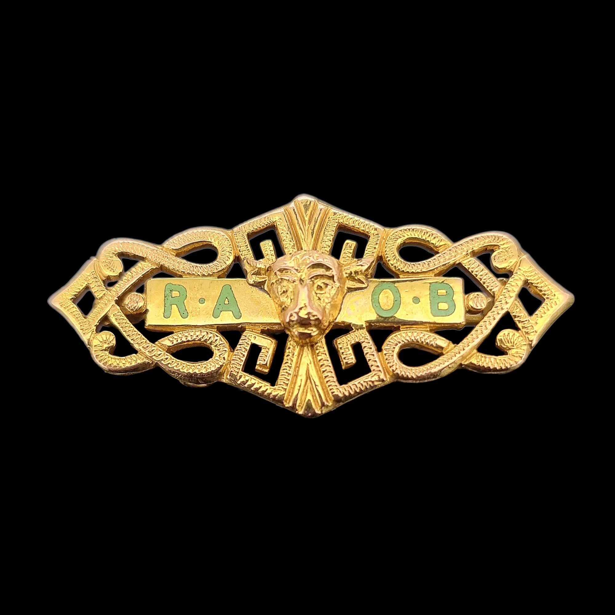 A traditional bar brooch in 9ct yellow gold, depicting a central 3D buffalo, with green enamelled text reading "R. A. O. B".
