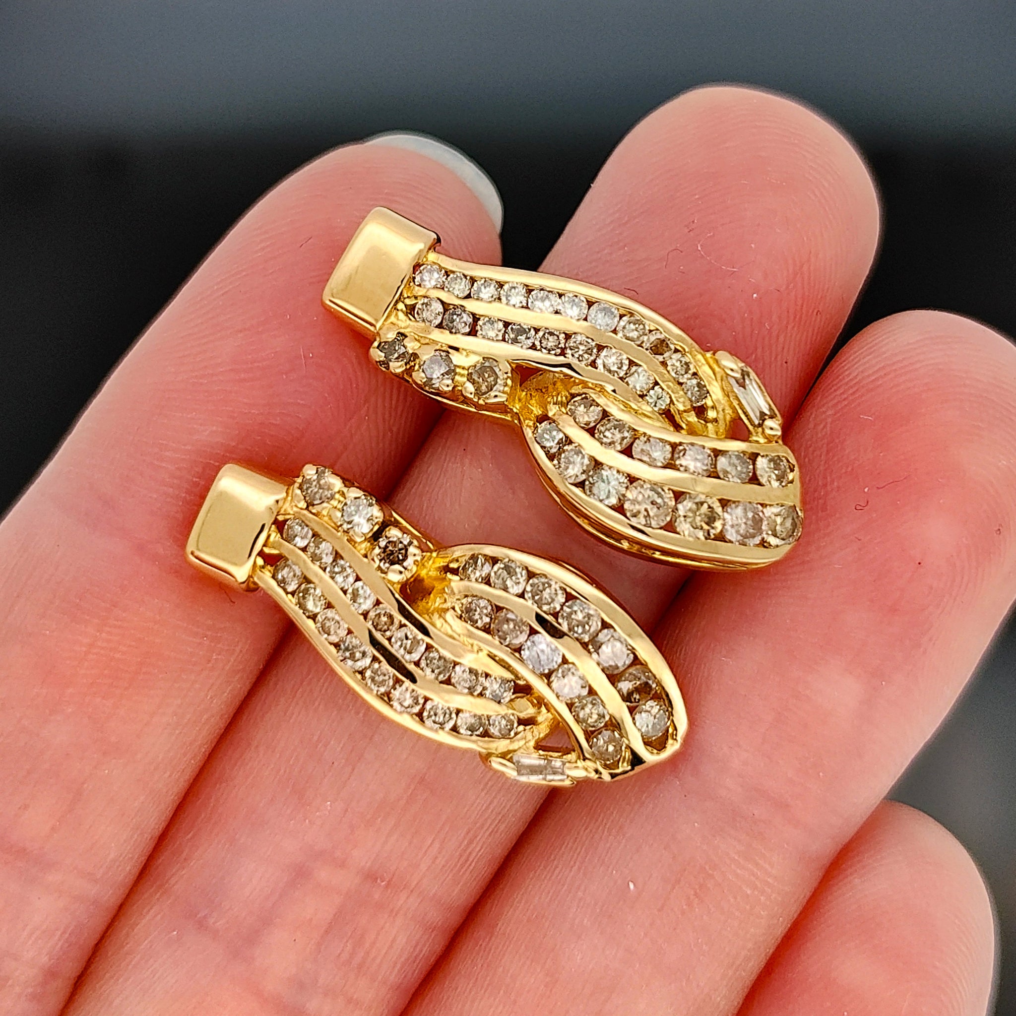 An impressive pair of drop earrings crafted in 18ct yellow gold, set with multiple brilliant cut diamonds and two tapered baguette cut diamonds, with standard posts and butterfly fittings.
