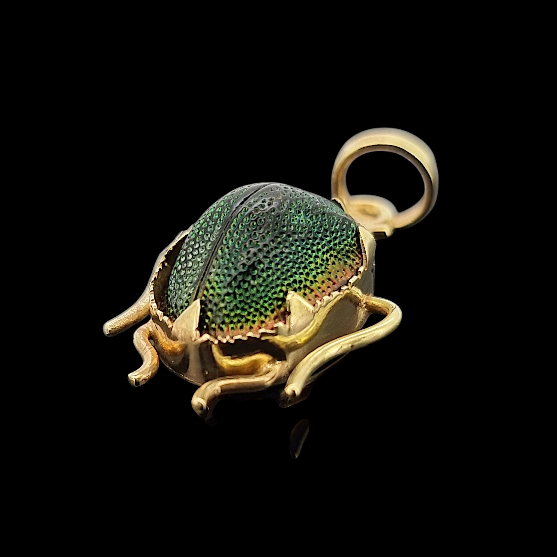 A fabulous antique pendant set with the shell of a real scarab beetle, the irridescent green body set within a 14ct yellow gold mount, with a pendant loop. Starting from the late 19th century, pieces such as scarab beetles were used in jewellery during what was known as the "Egyptian Revival" period.