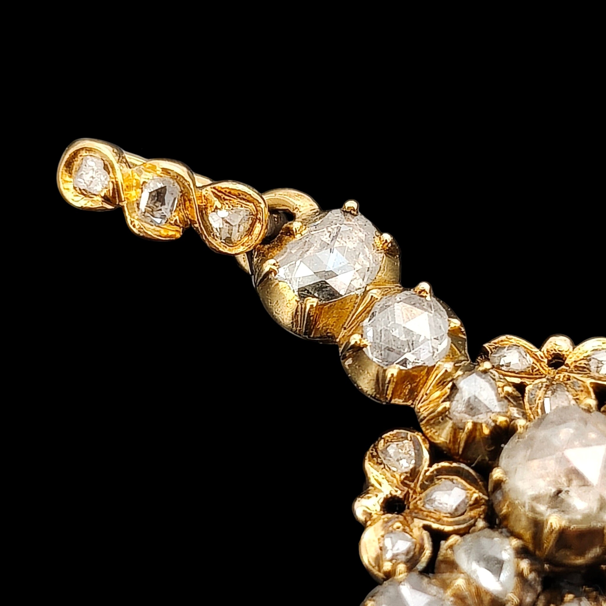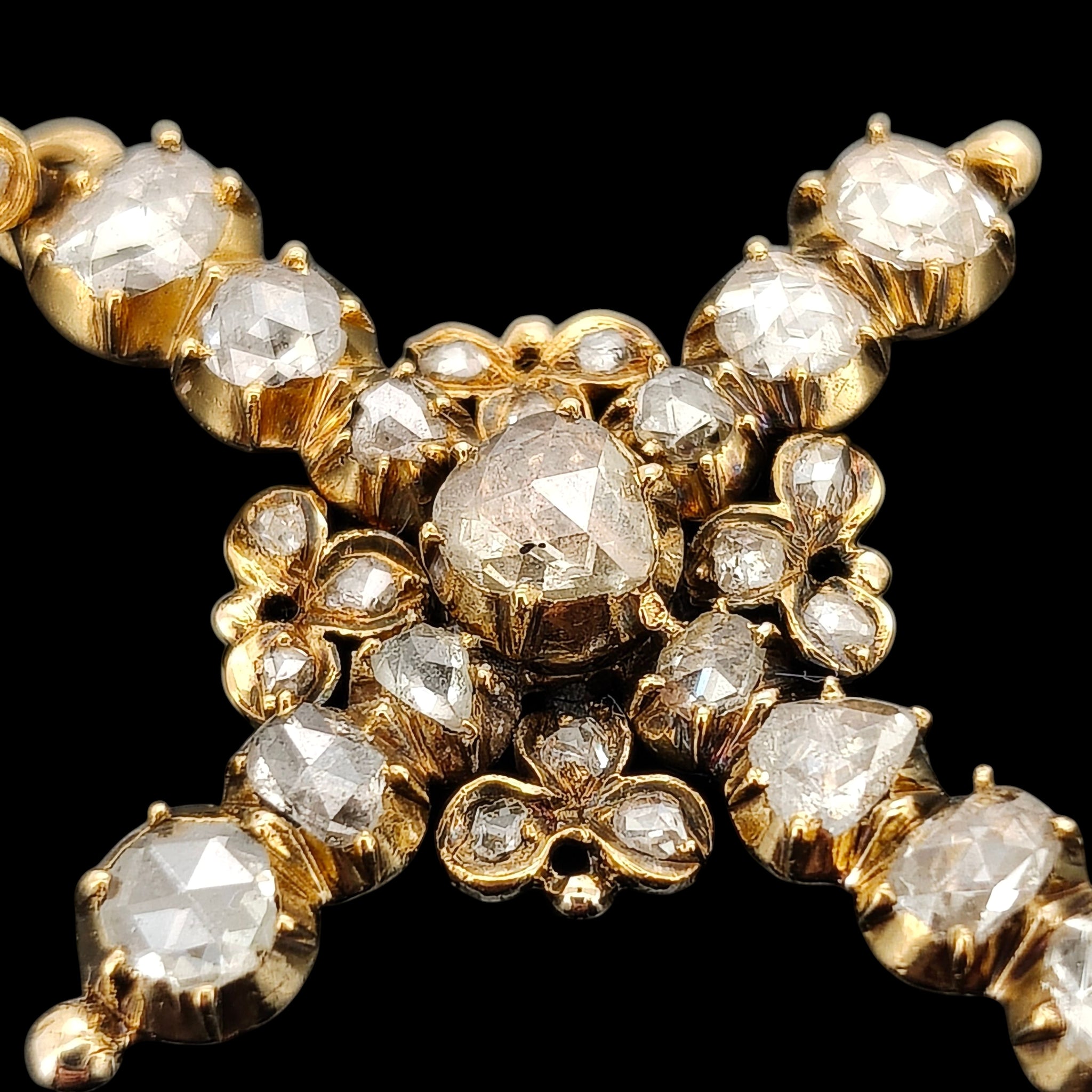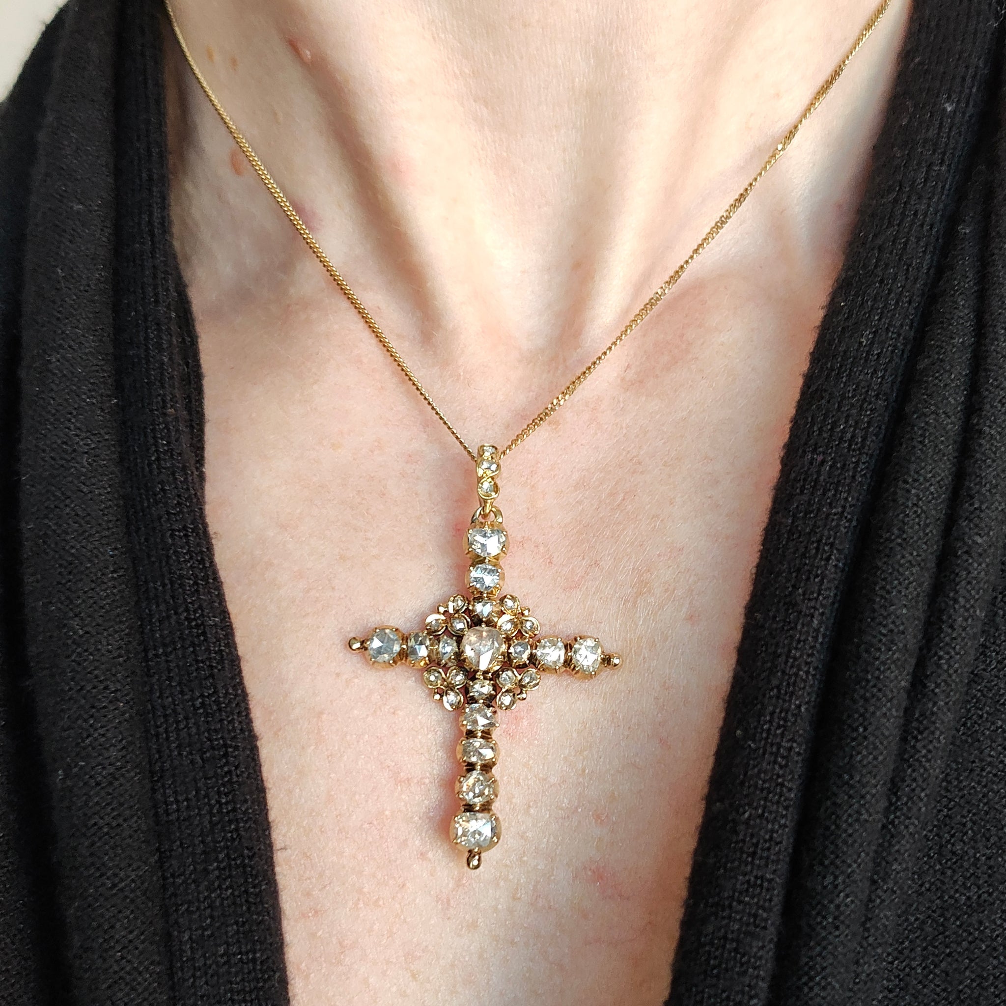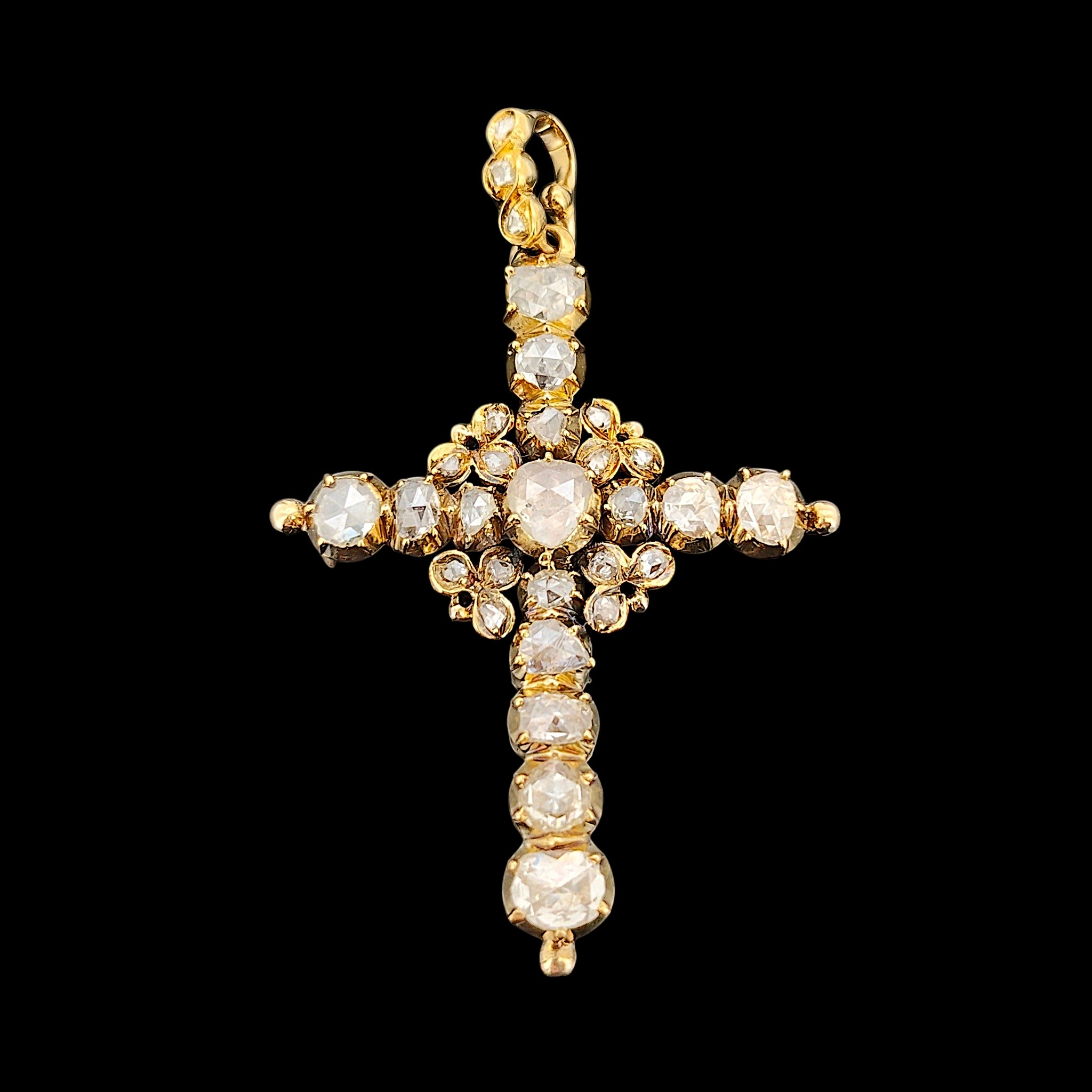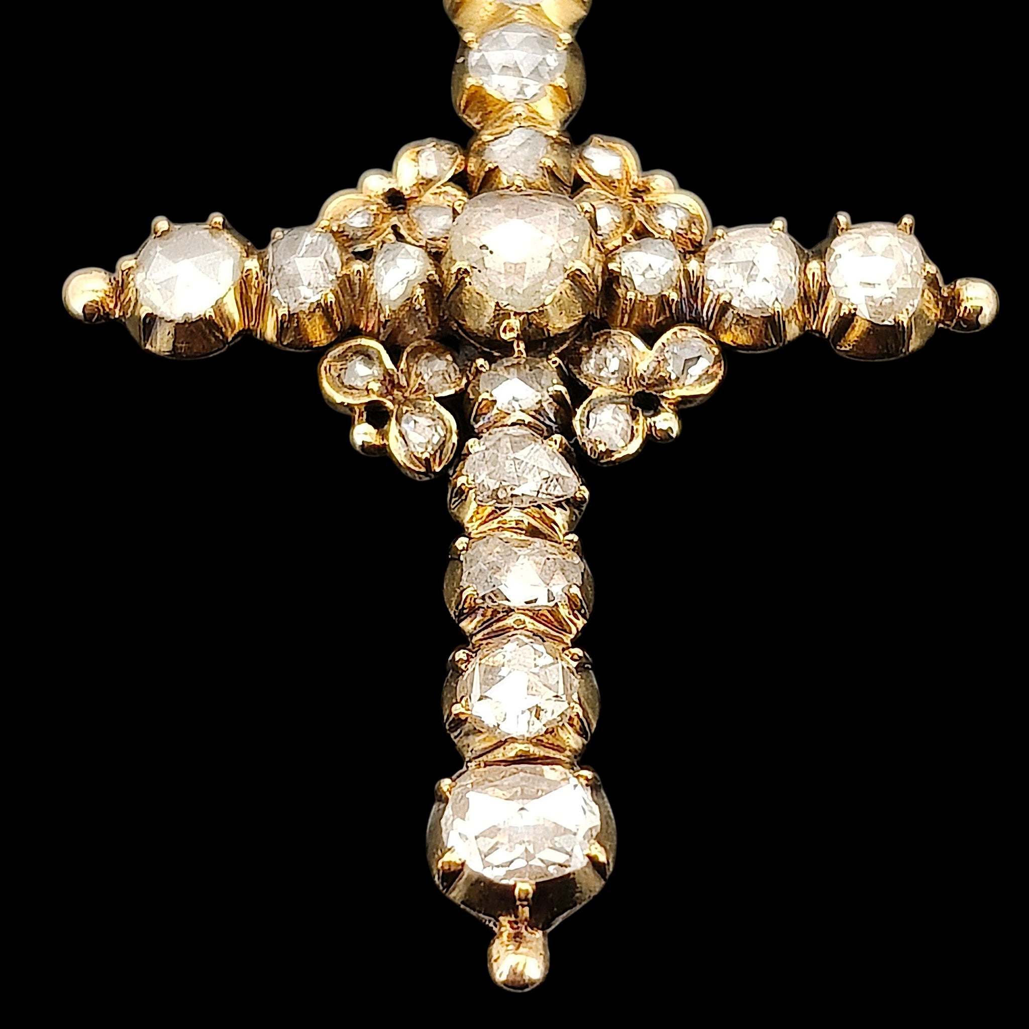 An incredible, impressive antique cross pendant adorned with old rose cut diamonds in varying shapes and sizes, claw set and mounted in 18ct yellow gold with a closed back setting, the halter also set with three rose cut diamonds. Beautifully preserved and ready to be appreciated by a new owner.