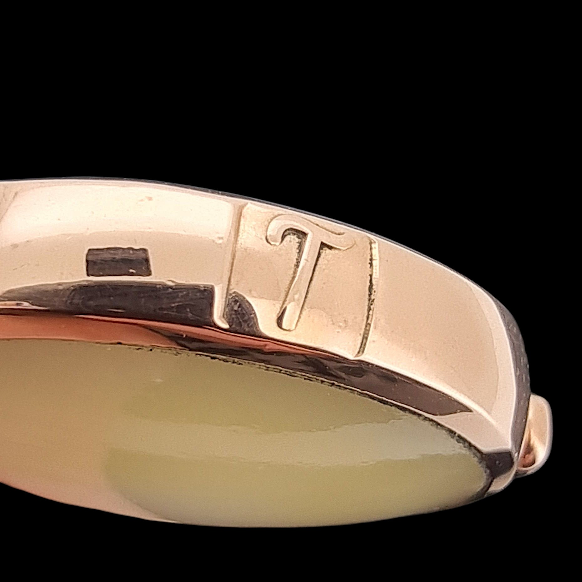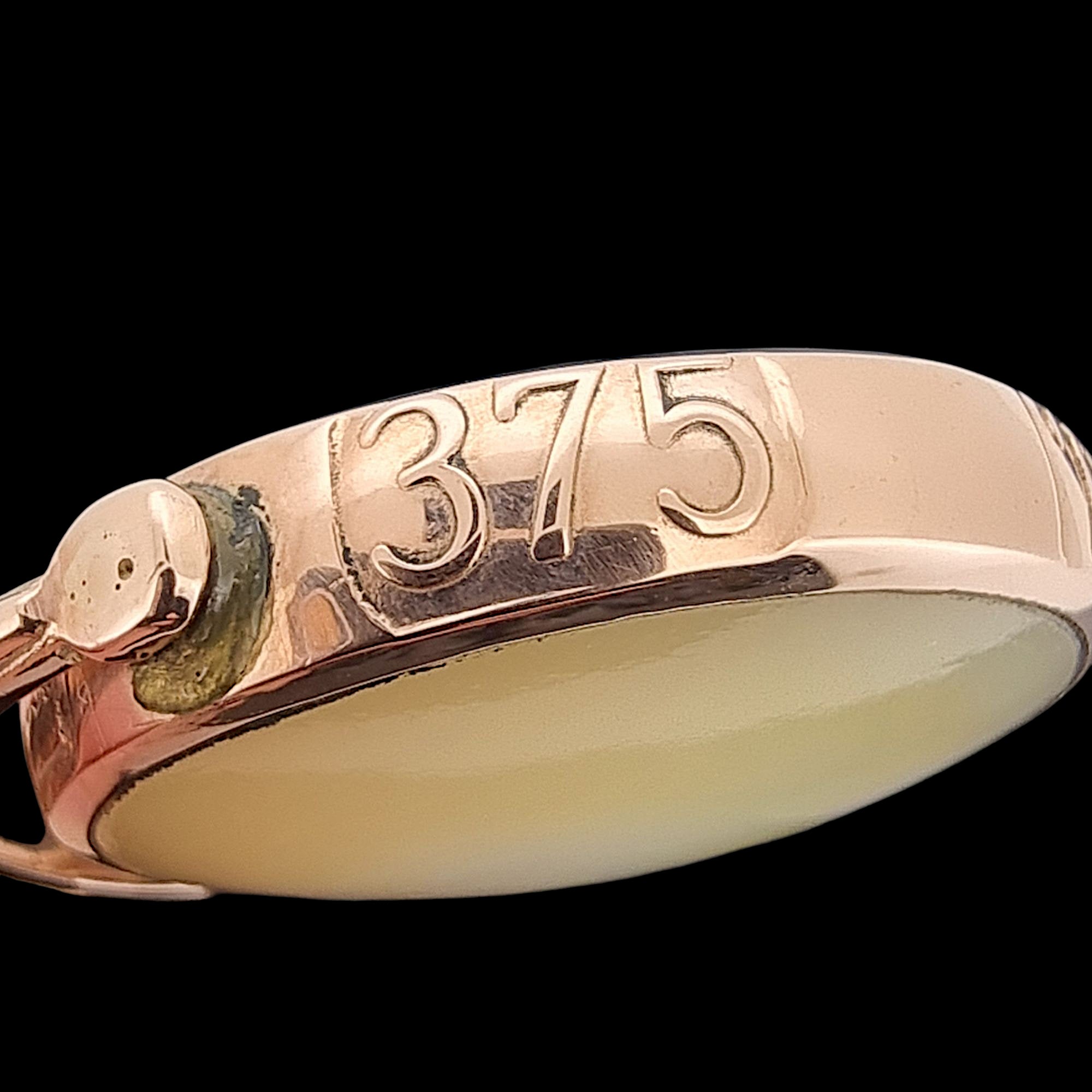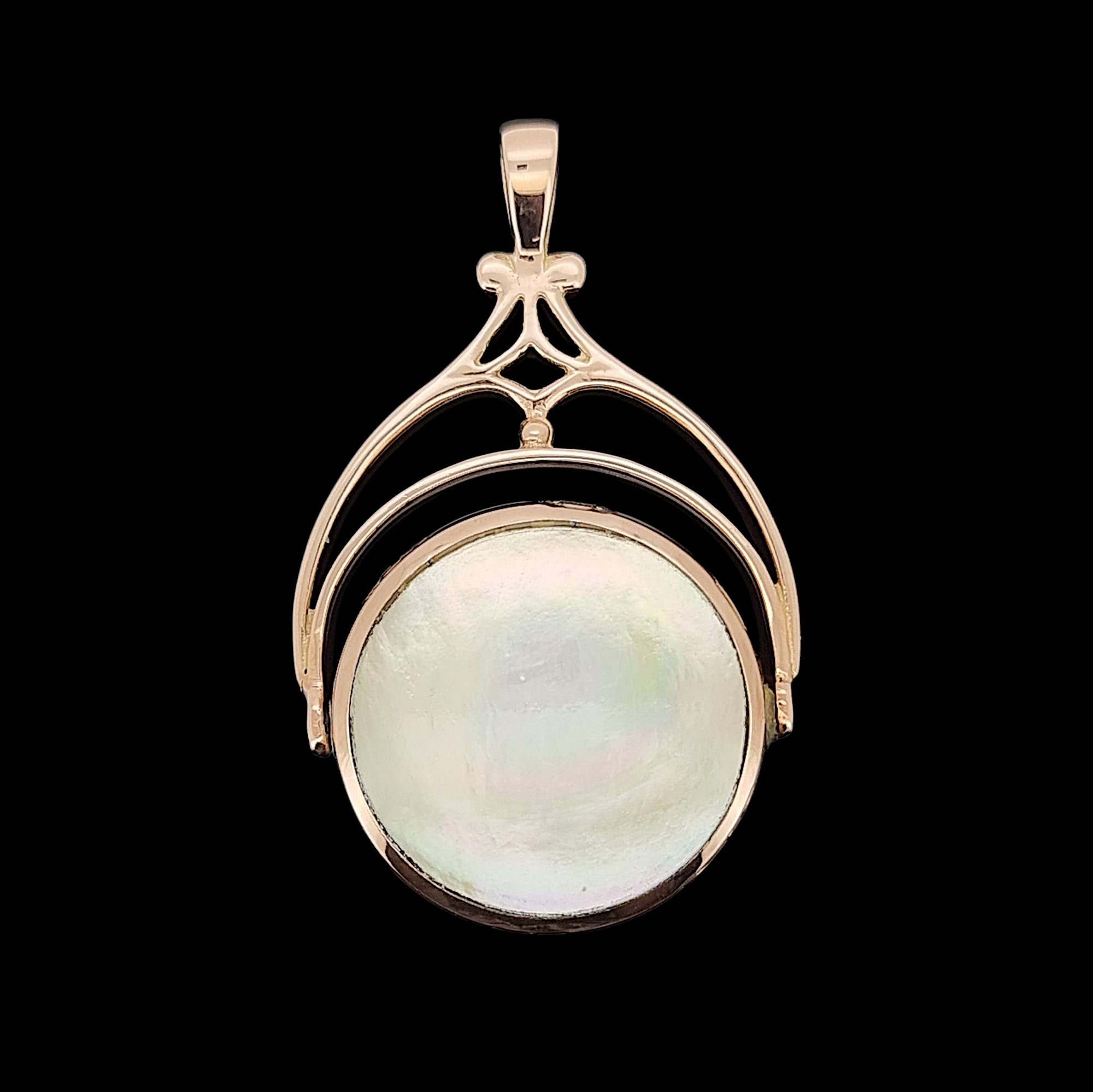 An impressive vintage swivel pendant, the circular body featuring mother of pearl to one side and banded agate to the other, mounted in 9ct rose gold, with a large, English, feature hallmark to the rim.