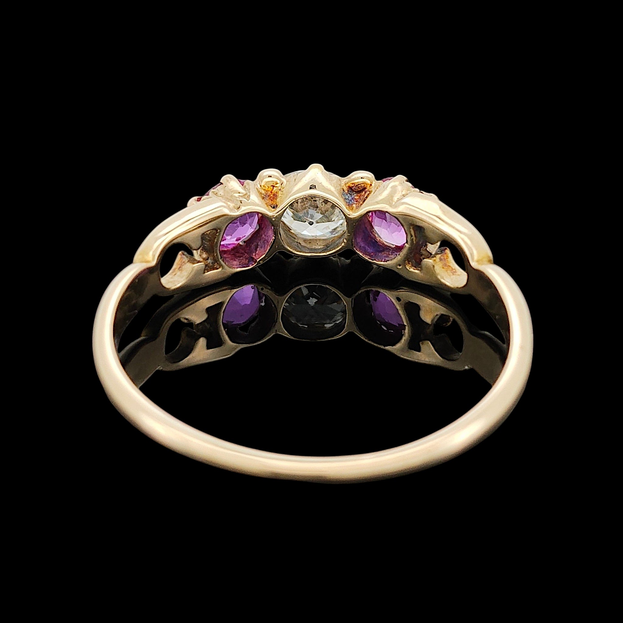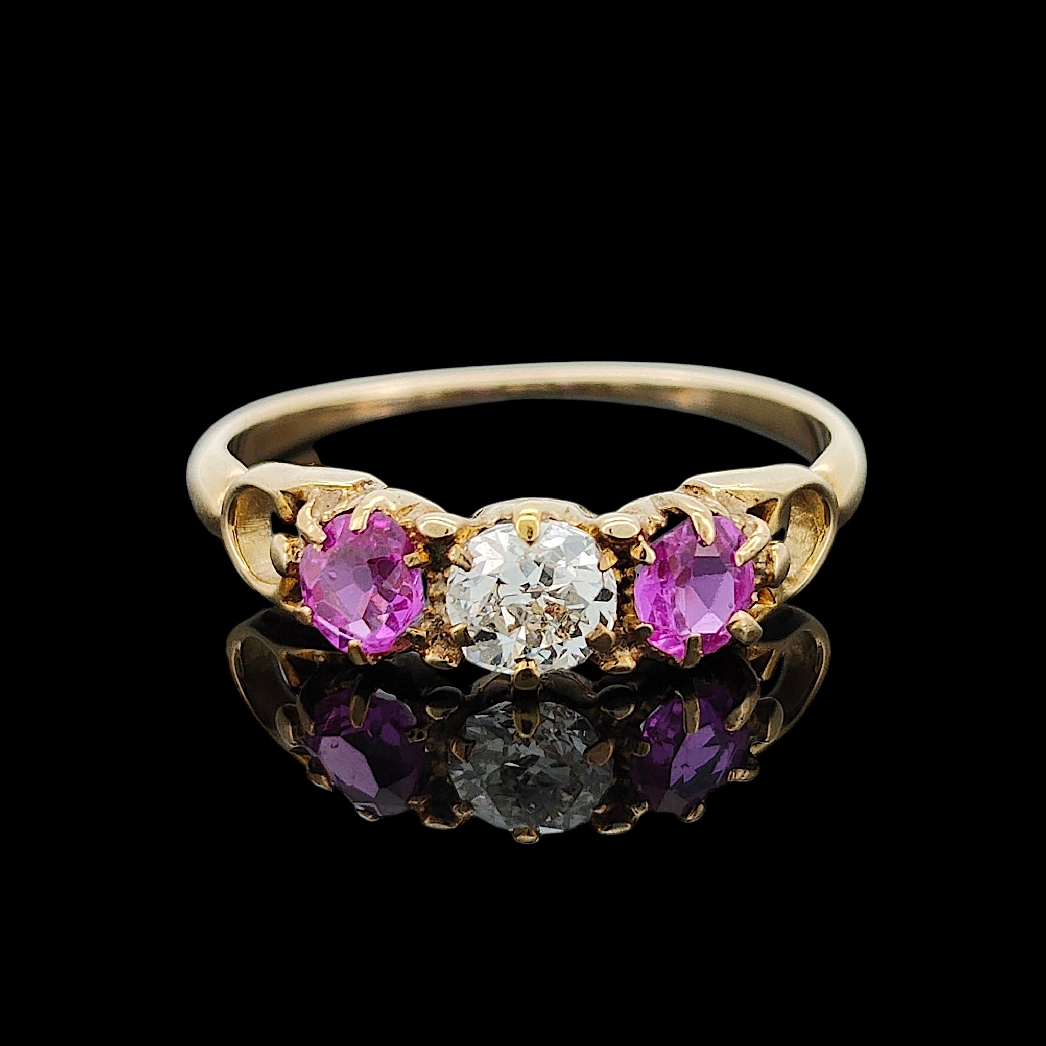 A beautiful late Victorian to Edwardian era three stone ring, the central old cut diamond flanked either side by a round, old cut pink ruby, claw set and mounted in an attractive 18ct yellow gold mount with open shoulders.