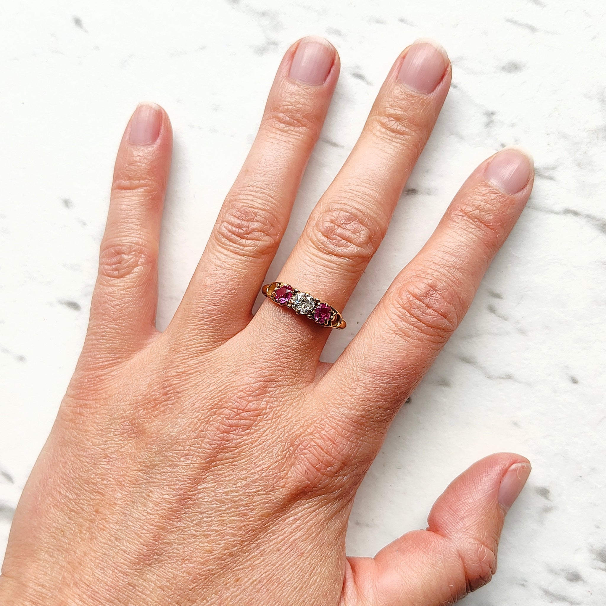 Antique 18ct Yellow Gold Ruby and Diamond Three Stone Ring