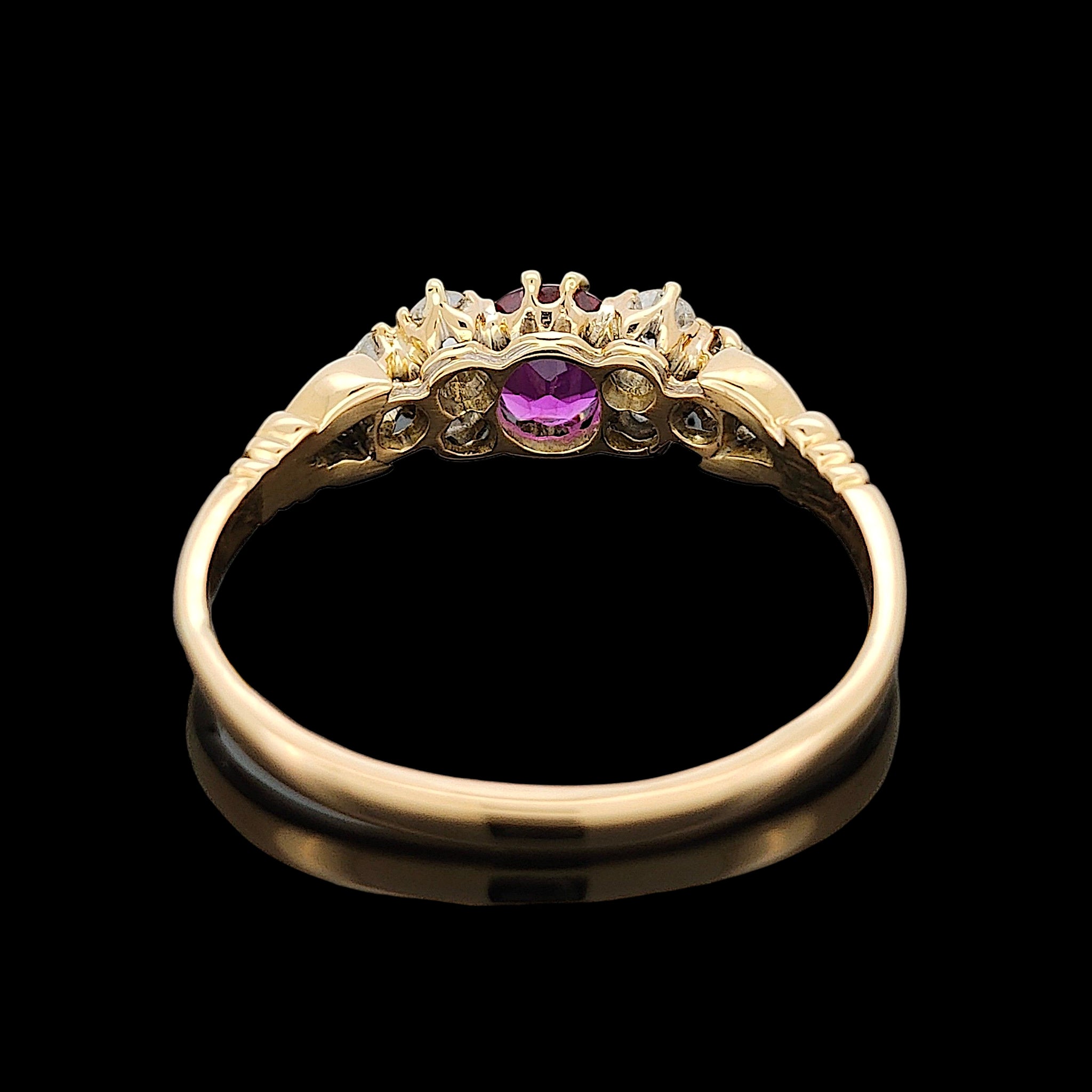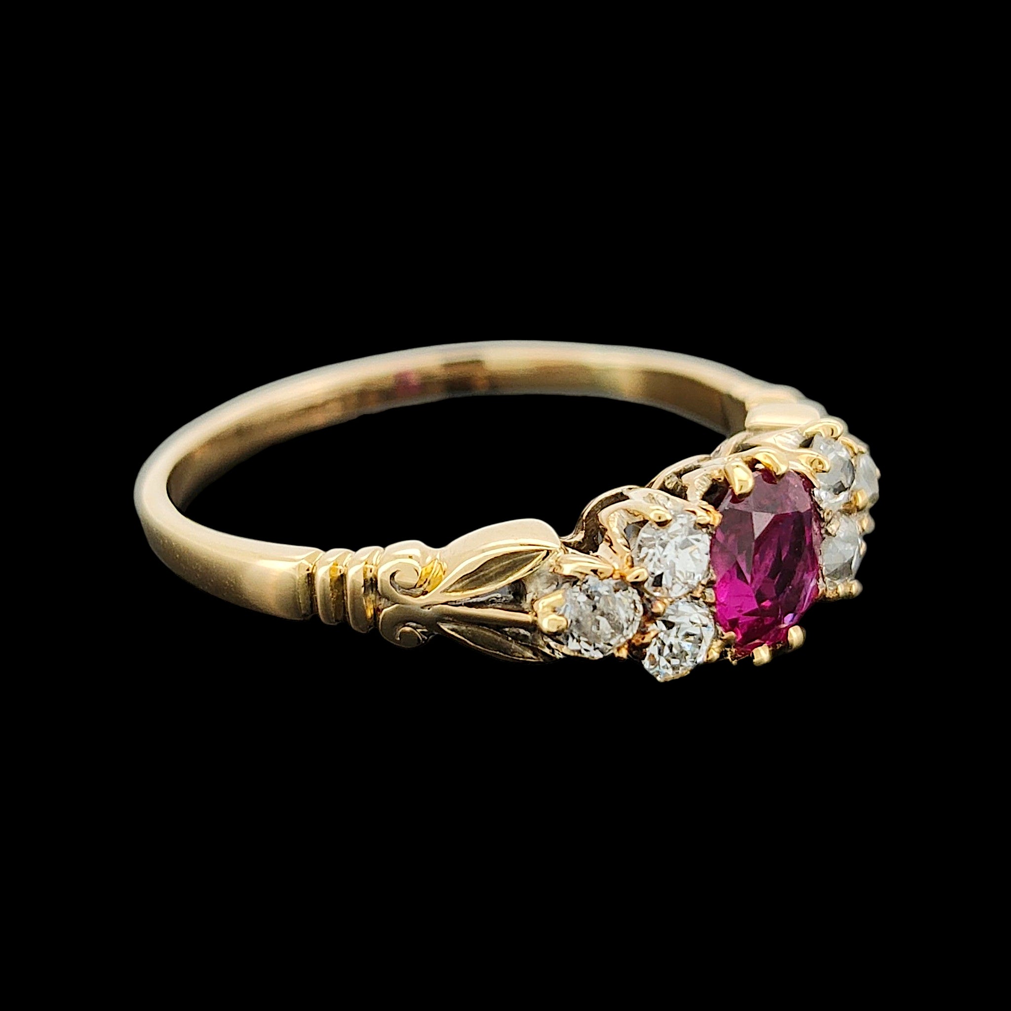 A stunning antique ring from the late Victorian to Edwardian period, featuring a cushion shaped old cut ruby to the centre, with a trefoil of round, old cut diamonds set to each side, mounted in 18ct yellow gold with decorative scrolled shoulders.