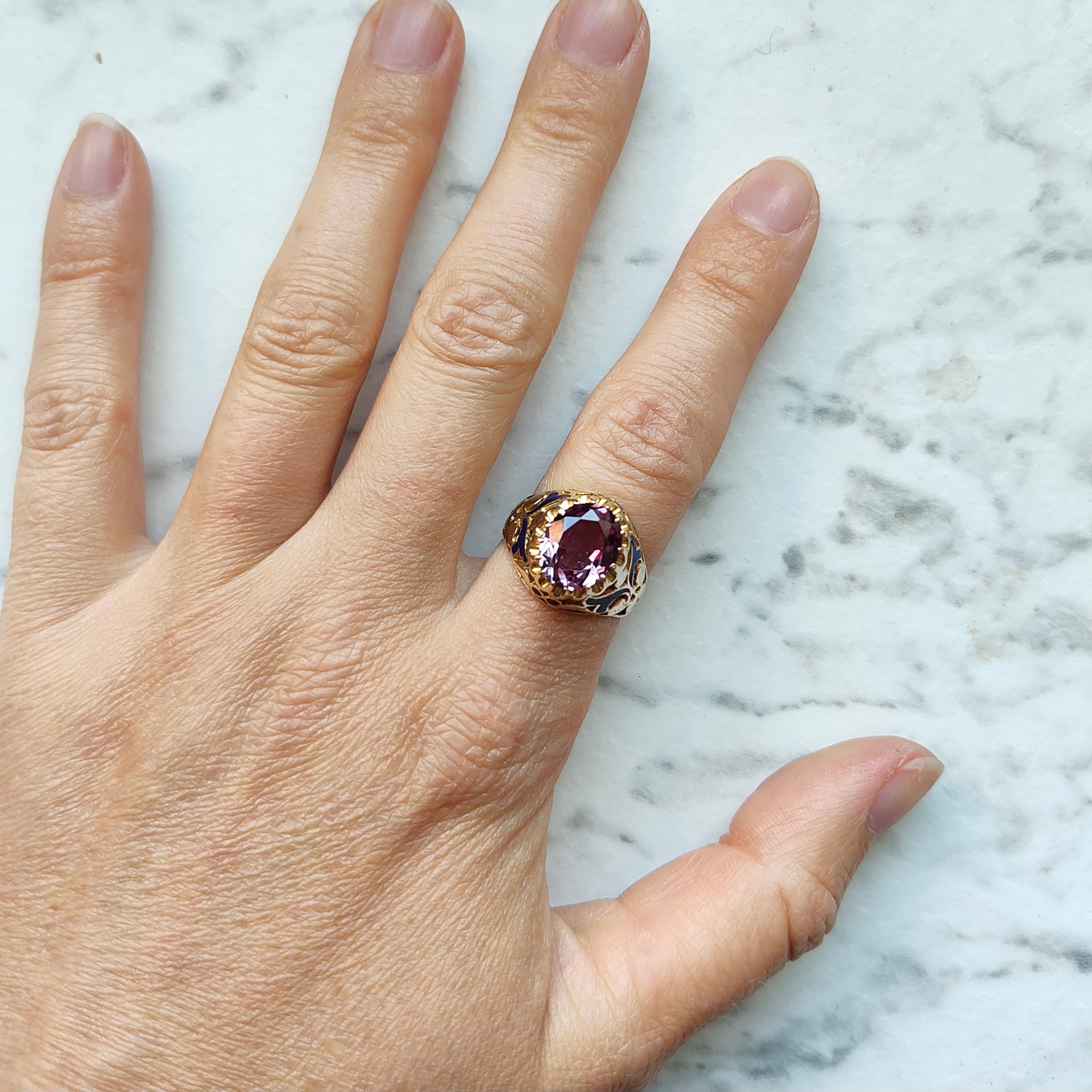 An eye-catching solitaire statement ring featuring an oval synthetic alexandrite of a rich purple colour, claw set within a tall 14ct yellow gold open setting, with blue enamel detailing around the gallery and shoulders.