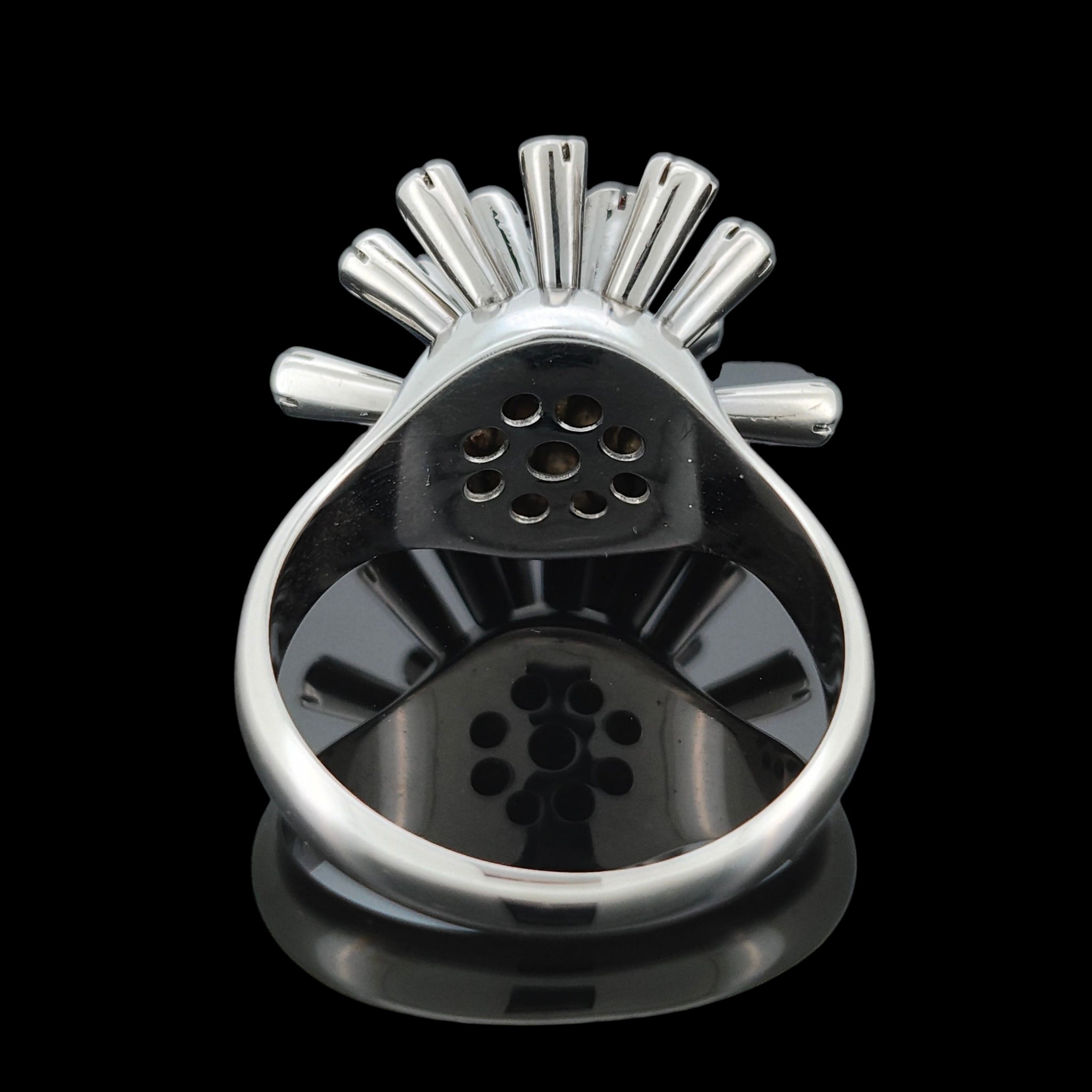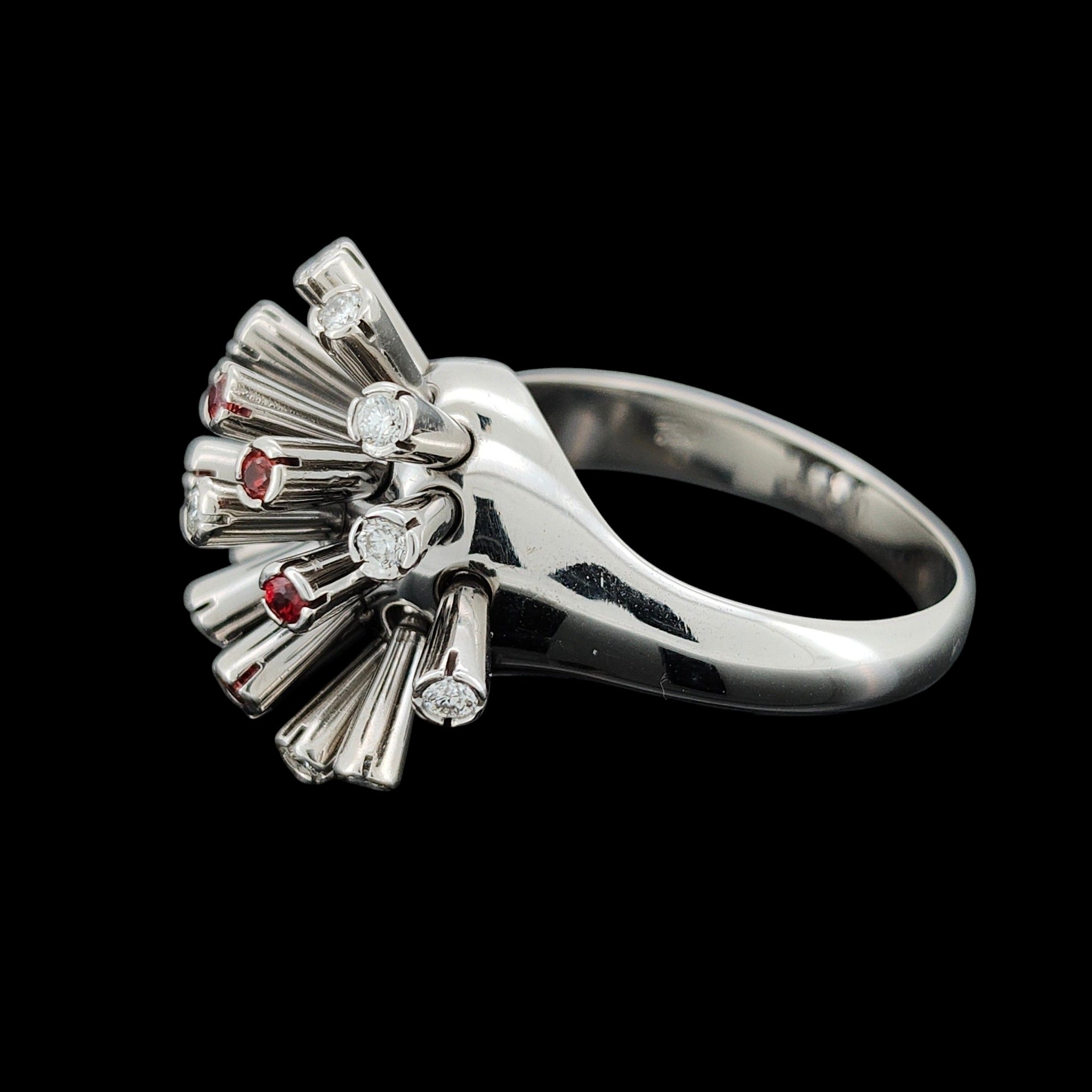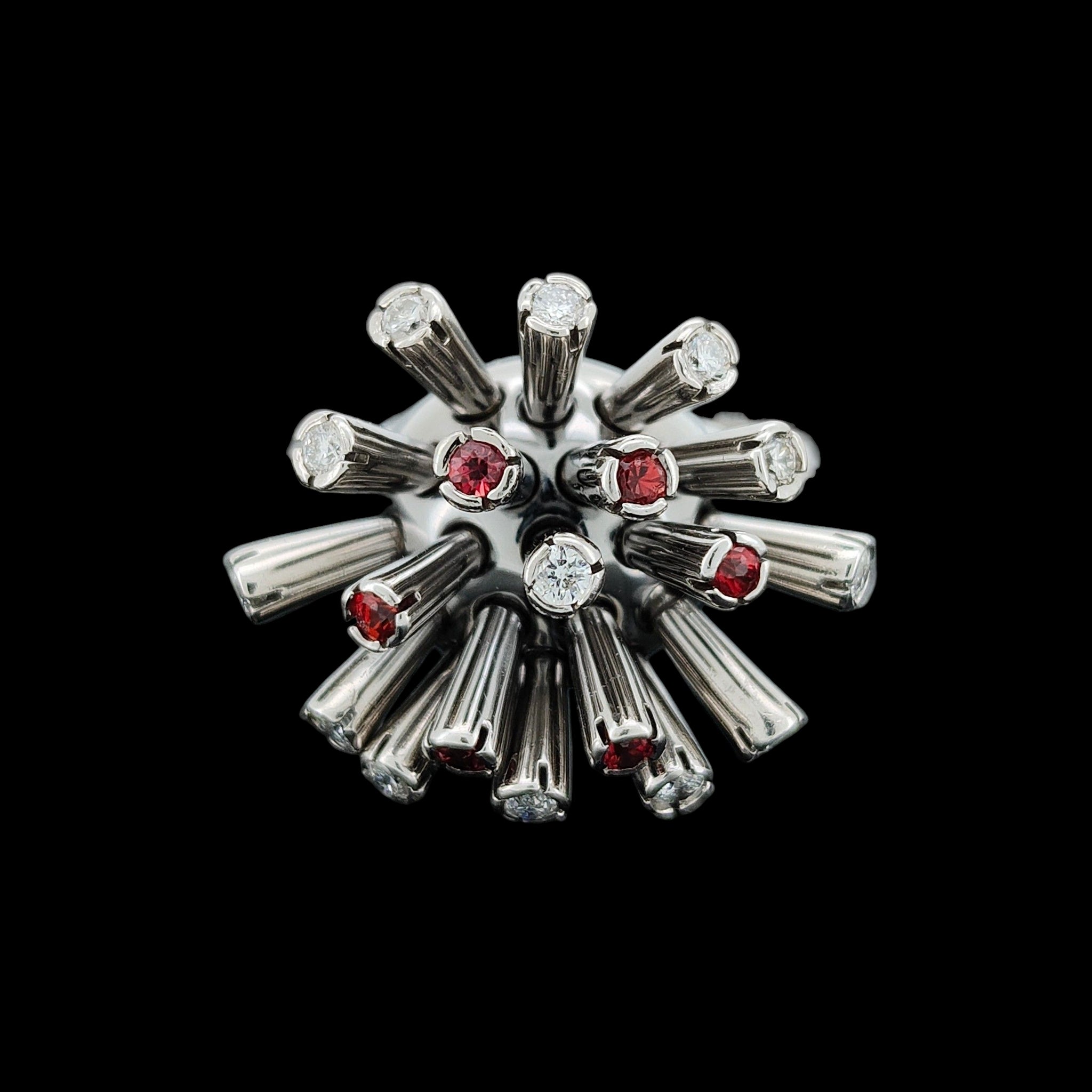 An incredible, fun and funky "Sputnik" ring, so-called to commemorate the first Sputnik launch in the 1960's. This fabulous example is fully made in 18ct white gold, and features moving spindles, set with round rubies and round diamonds.