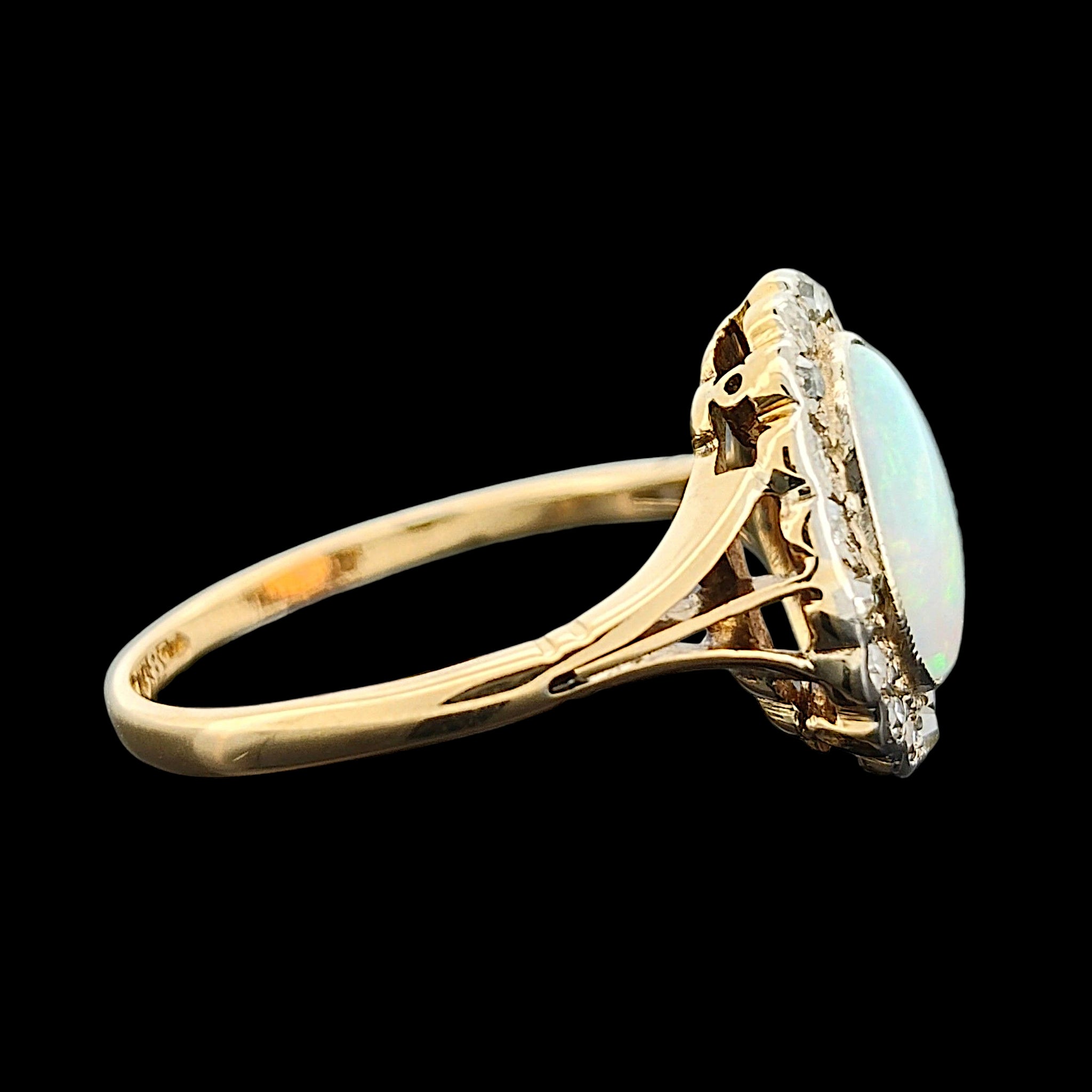 A classic oval cluster ring featuring a central opal, surrounded by eighteen round, single cut diamonds in a bezel/scalloped edge setting, all crafted in 18ct yellow and white gold, with attractive split shoulders.