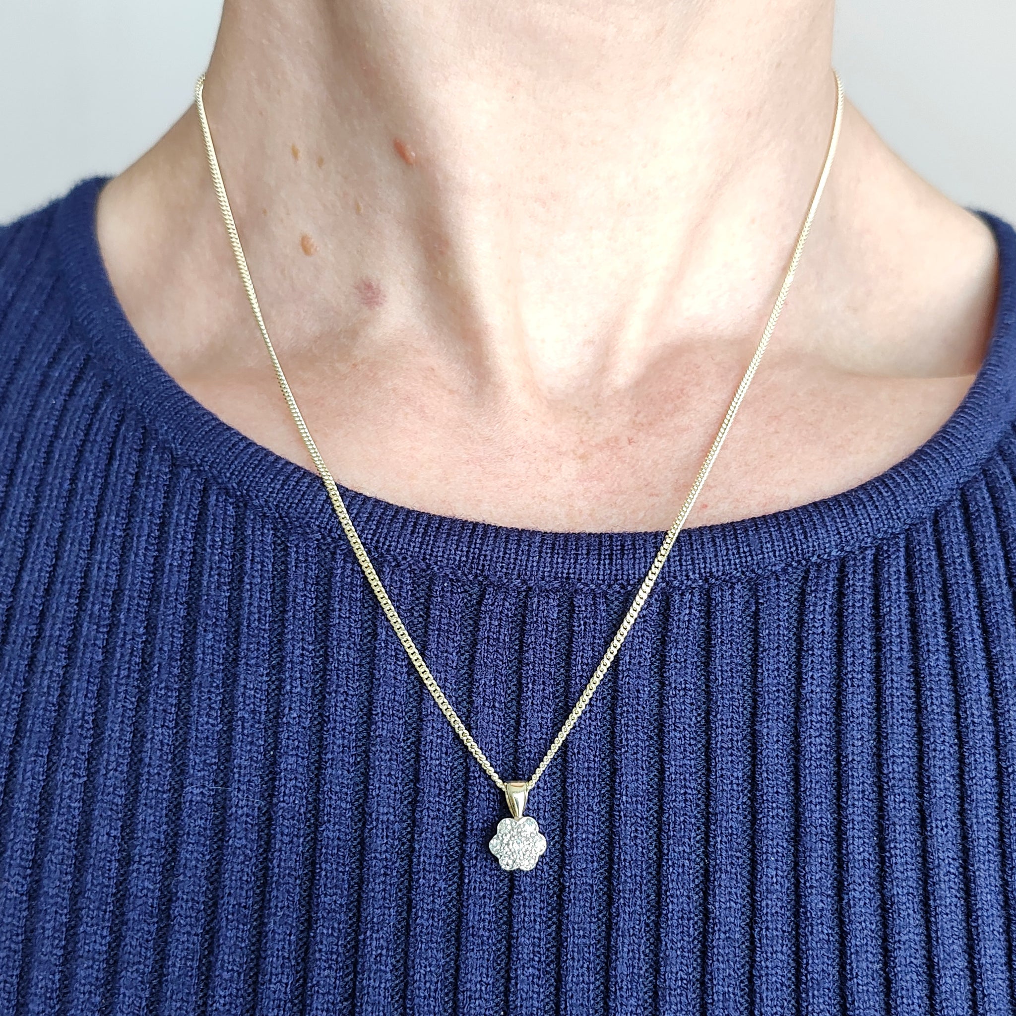 An attractive, vintage diamond cluster pendant, mounted in 18ct yellow and white gold, set with seven, round, single cut diamonds in a traditional flower shaped cluster.