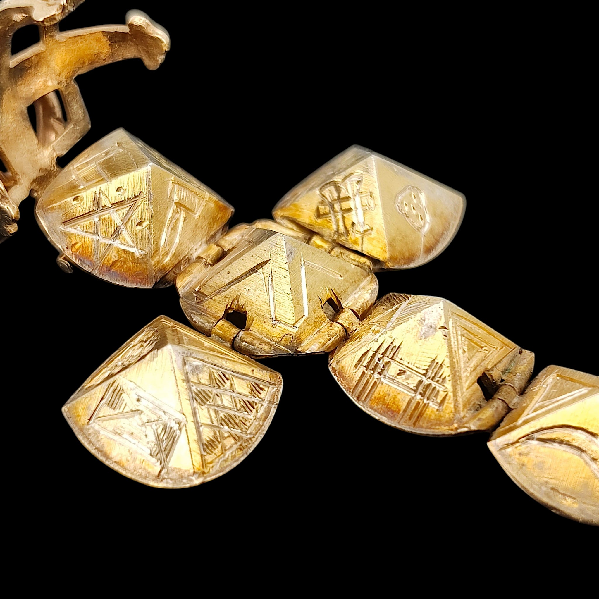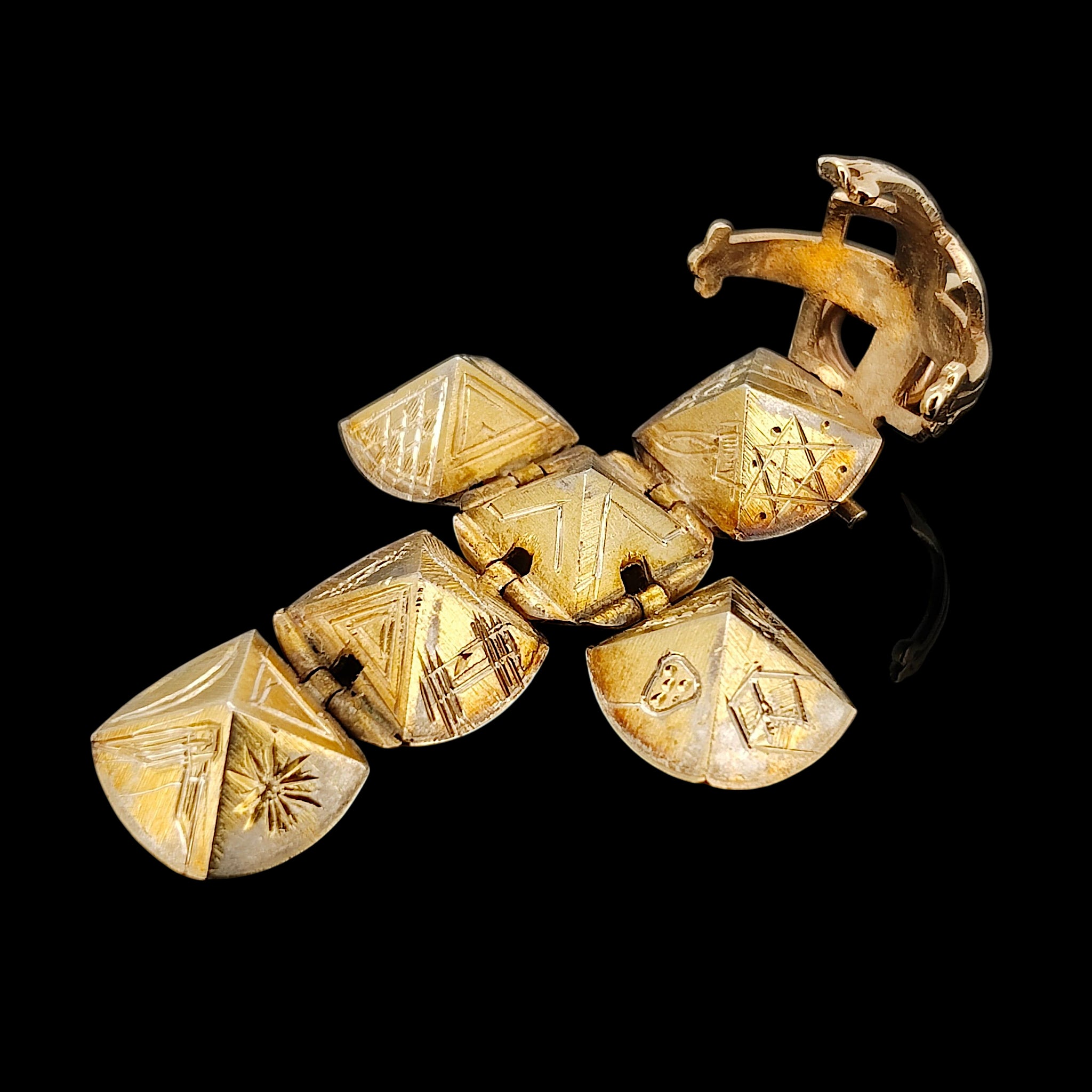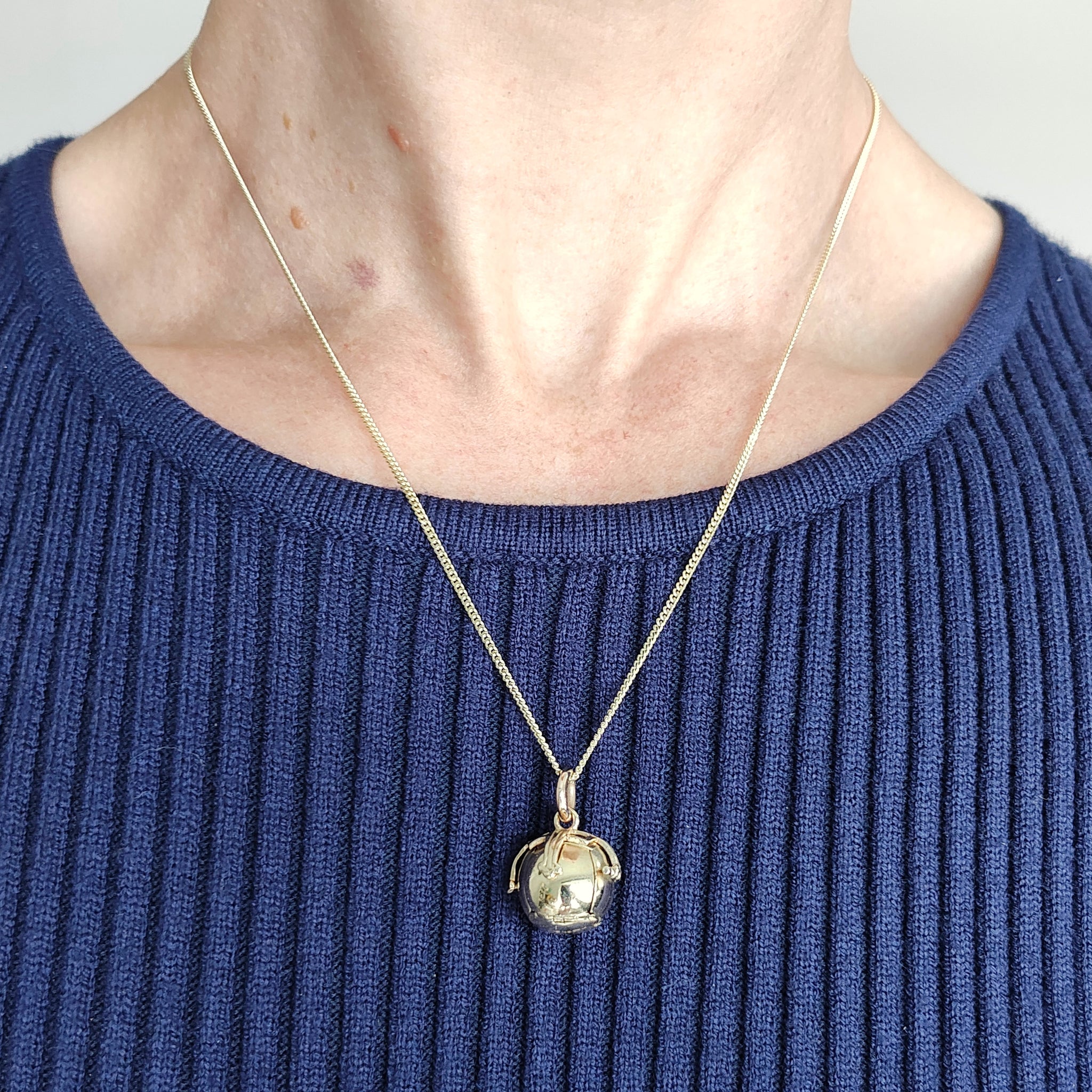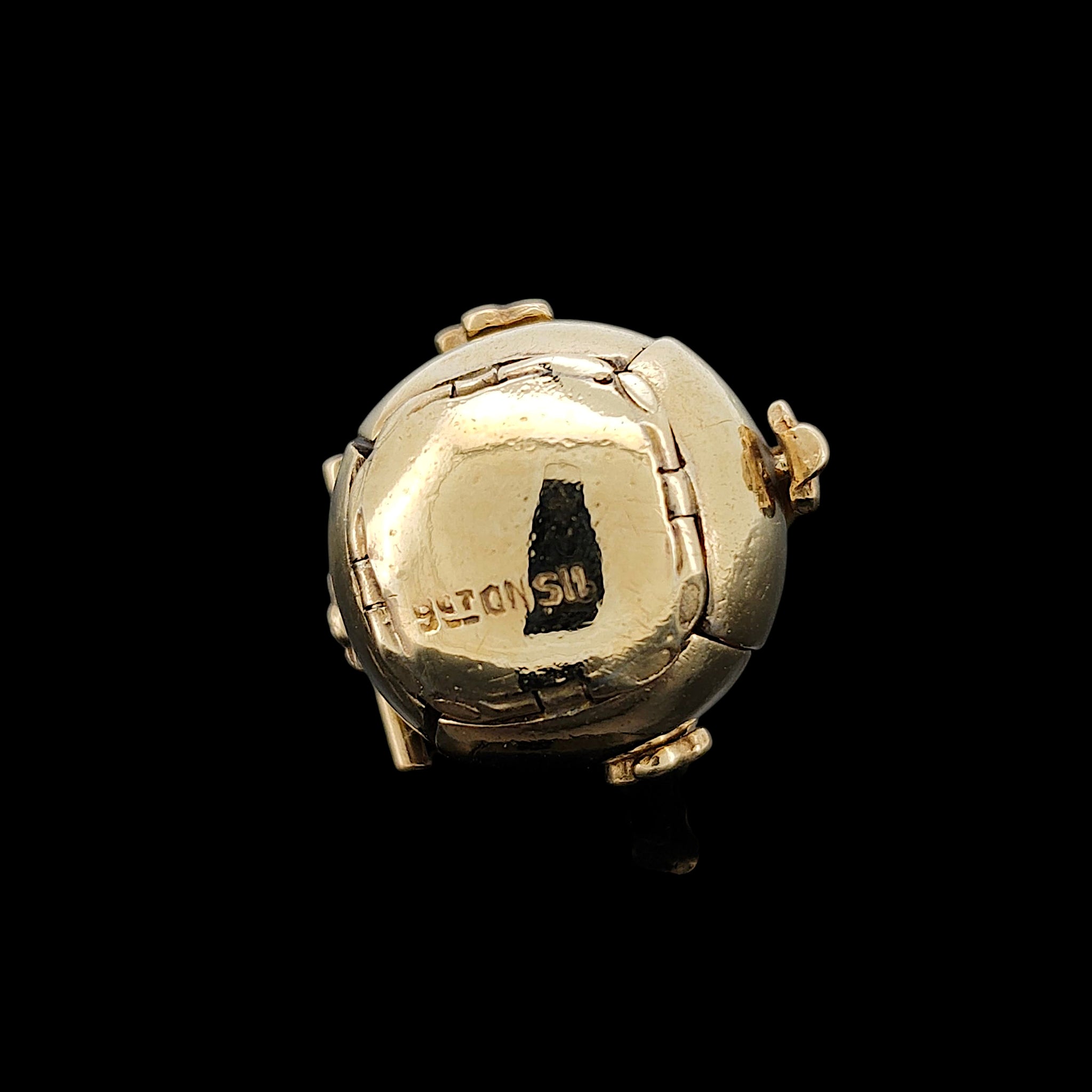 An intriguing and ever-popular folding masonic ball, crafted in silver and 9ct yellow gold. The ball is clasped, and can be unfolded to reveal a cross which is engraved with a multitude of masonic symbols. A fun piece to add to an Albert, charm bracelet or wear as a pendant on a chain.