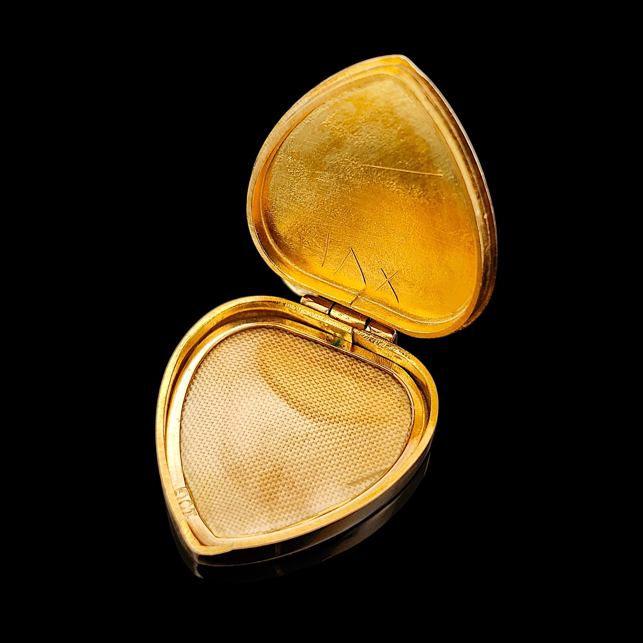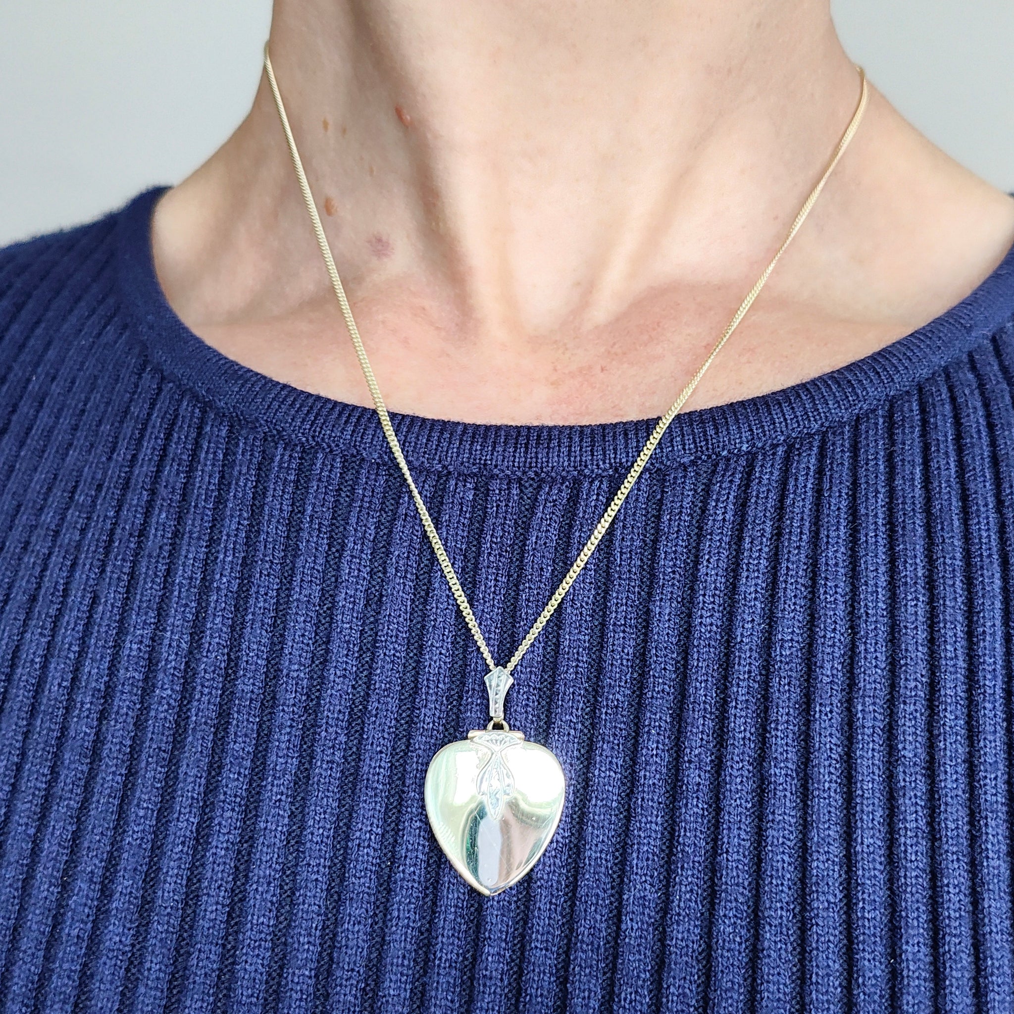 A beautiful Art Deco era locket pendant shaped as a heart, unusually made in 9ct yellow gold with palladium details, the locket opening from the bottom rather than from the side. A unique and gorgeous piece.