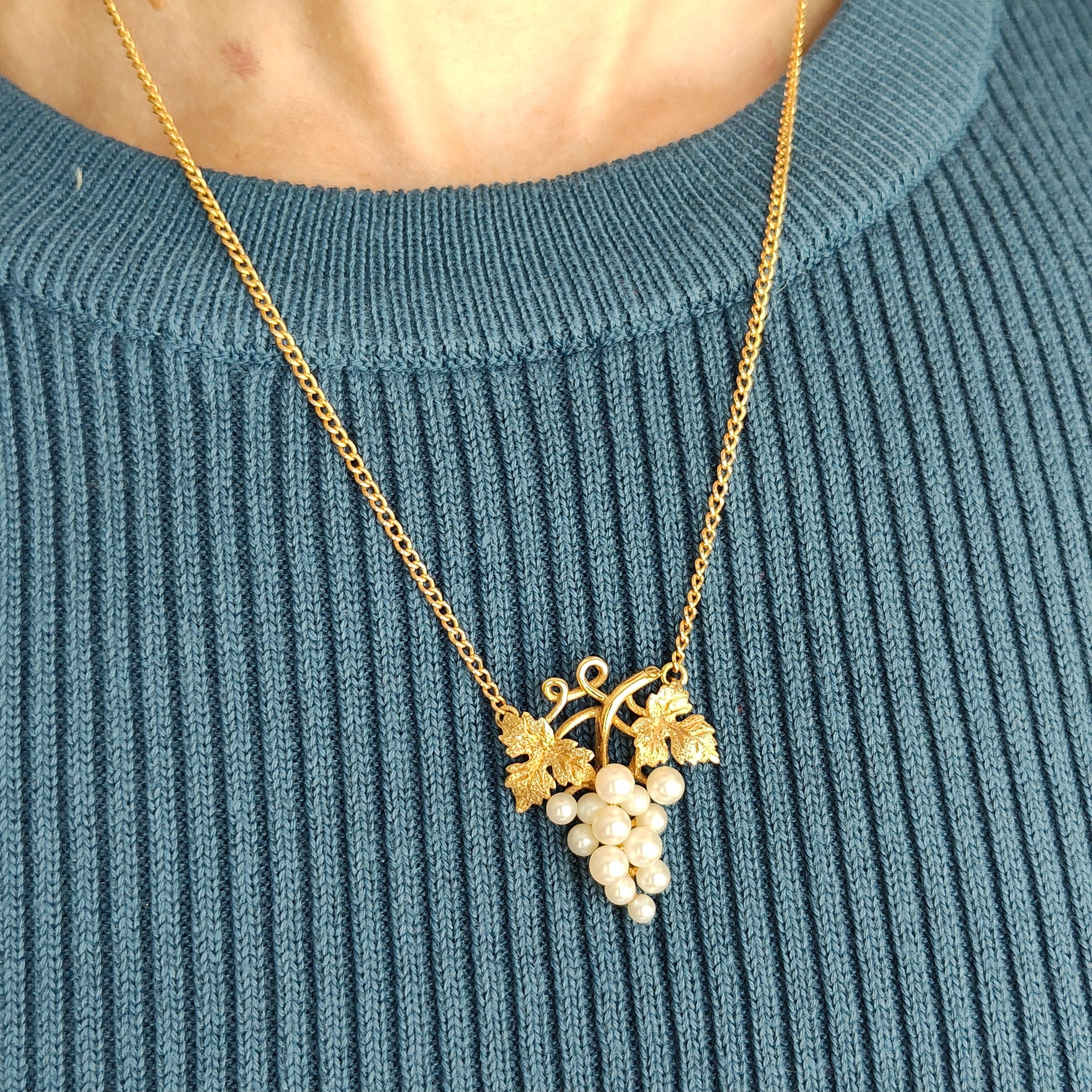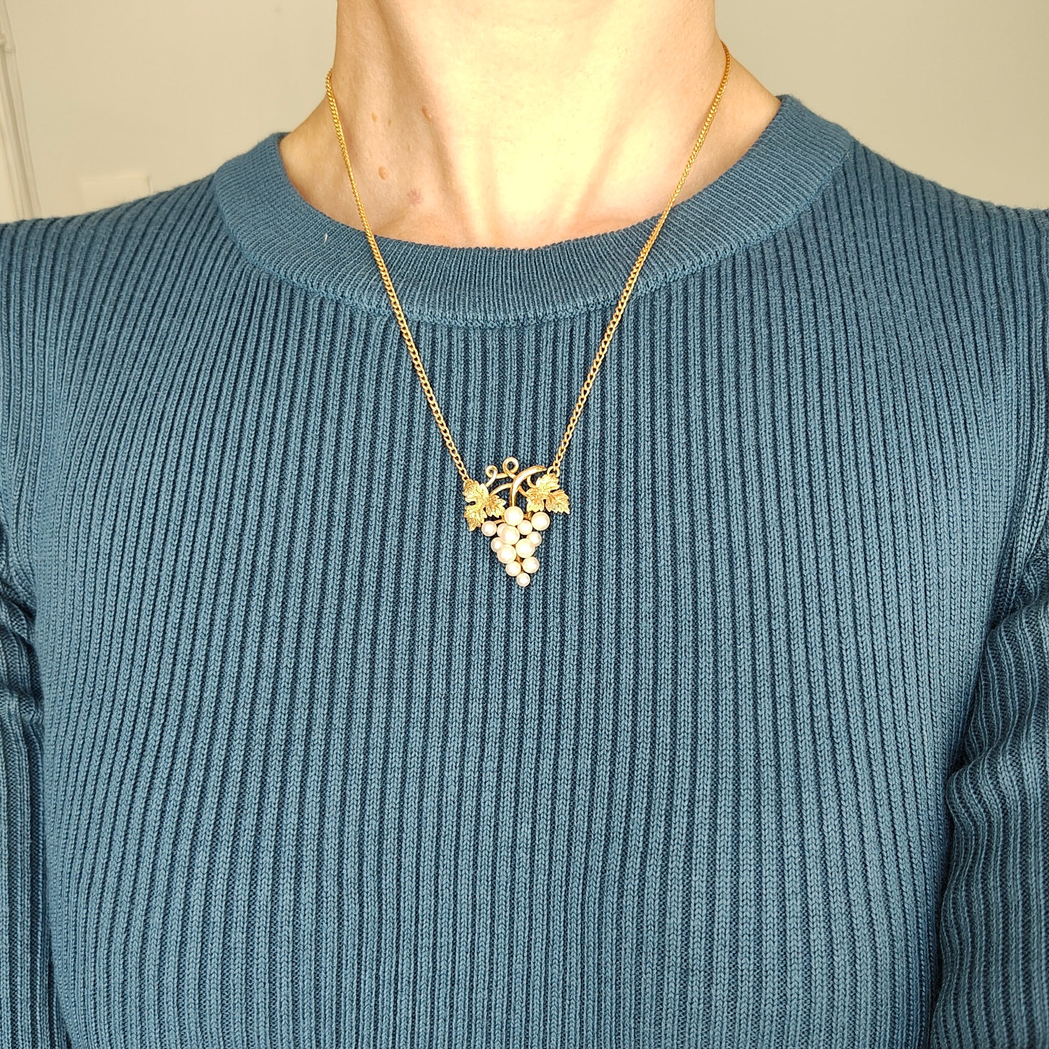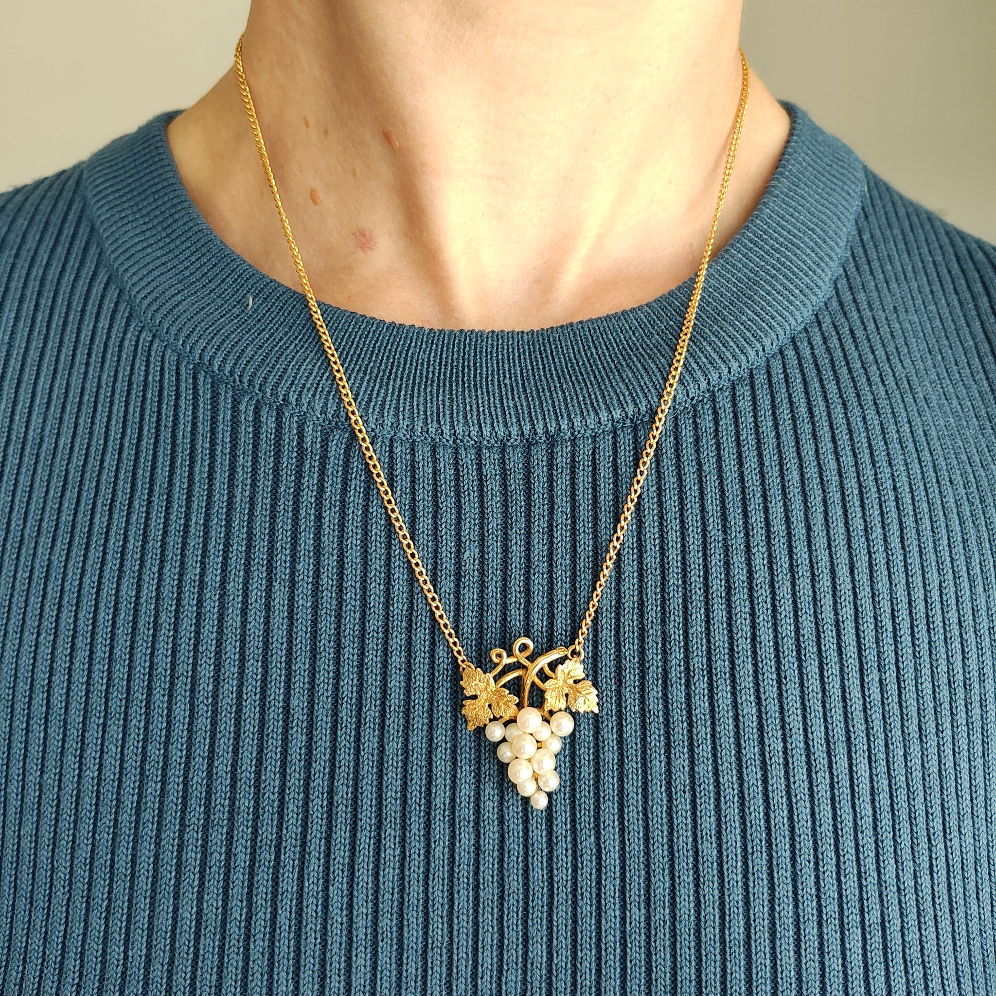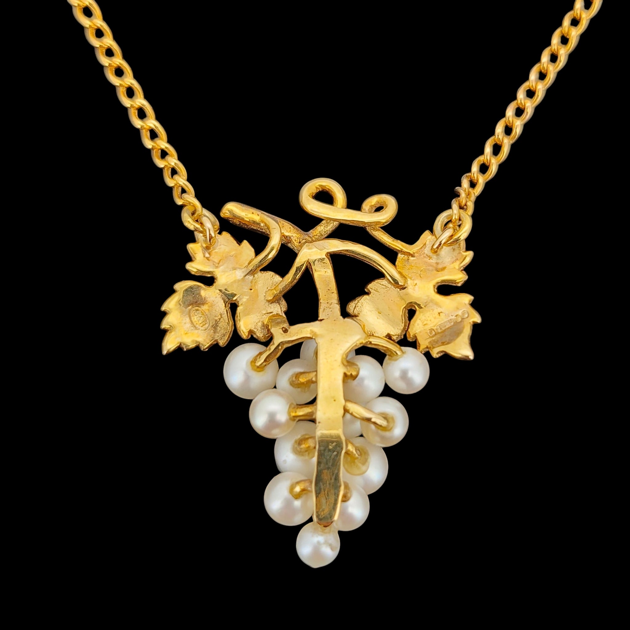 A beautiful vintage necklace from the 1960's, the pearl pendant representing a juuicy bunch of grapes, with detailed vine and leaves, on an integrated curb link chain, all in 9ct yellow gold.